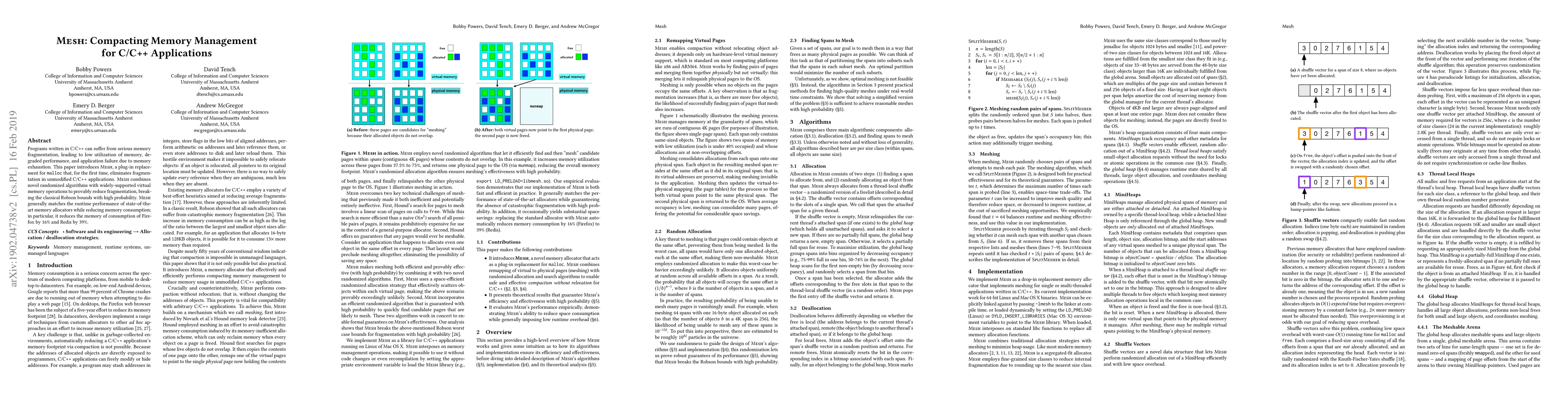Mesh is a plug-in replacement for malloc that eliminates memory fragmentation in C/C++ applications, using randomized algorithms and virtual memory operations to reduce fragmentation and improve memory utilization. It matches the performance of state-of-the-art allocators while reducing memory consumption, notably decreasing Firefox's memory by 16% and Redis's by 39%.