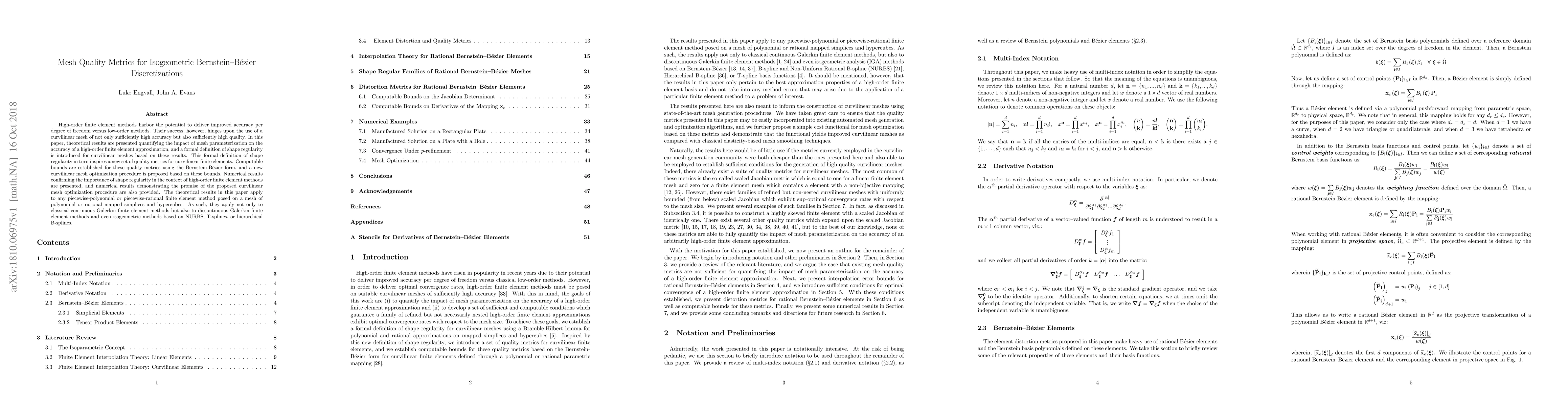 High-order finite element methods harbor the potential to deliver improved accuracy per degree of freedom versus low-order methods. Their success, however, hinges upon the use of a curvilinear mesh of not only sufficiently high accuracy but also sufficiently high quality. In this paper, theoretical results are presented quantifying the impact of mesh parameterization on the accuracy of a high-order finite element approximation, and a formal definition of shape regularity is introduced for curvilinear meshes based on these results. This formal definition of shape regularity in turn inspires a new set of quality metrics for curvilinear finite elements. Computable bounds are established for these quality metrics using the Bernstein-B\'ezier form, and a new curvilinear mesh optimization procedure is proposed based on these bounds. Numerical results confirming the importance of shape regularity in the context of high-order finite element methods are presented, and numerical results demonstrating the promise of the proposed curvilinear mesh optimization procedure are also provided. The theoretical results in this paper apply to any piecewise-polynomial or piecewise-rational finite element method posed on a mesh of polynomial or rational mapped simplices and hypercubes. As such, they apply not only to classical continuous Galerkin finite element methods but also to discontinuous Galerkin finite element methods and even isogeometric methods based on NURBS, T-splines, or hierarchical B-splines.