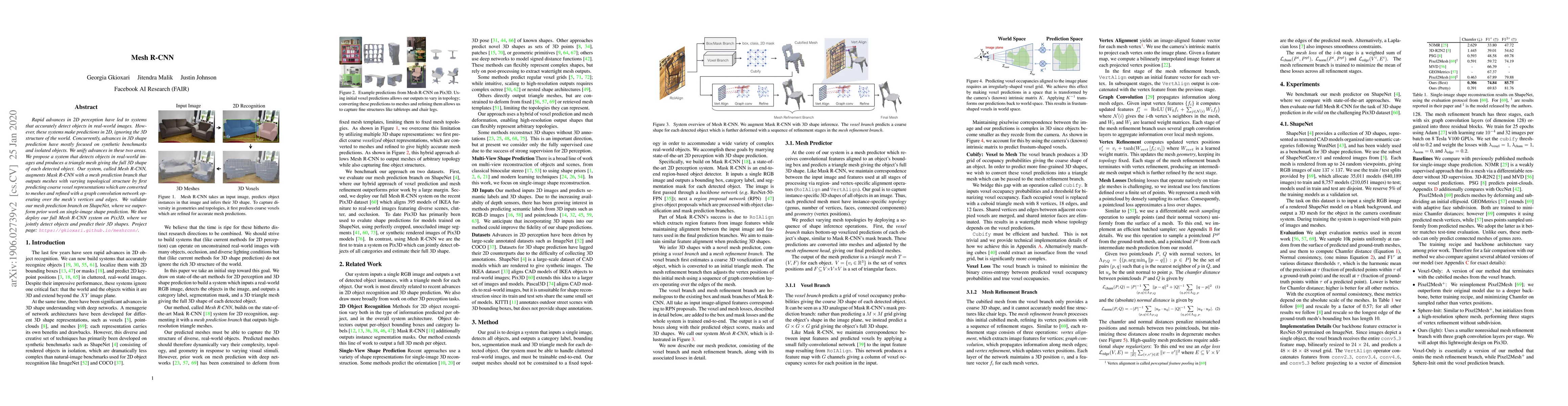 Mesh R-CNN builds upon Mask R-CNN by adding a mesh prediction branch, converting coarse voxel representations into detailed 3D meshes of detected objects in real-world images. It outperforms existing methods on single-image shape prediction on ShapeNet and demonstrates accurate object detection and 3D shape prediction on Pix3D.