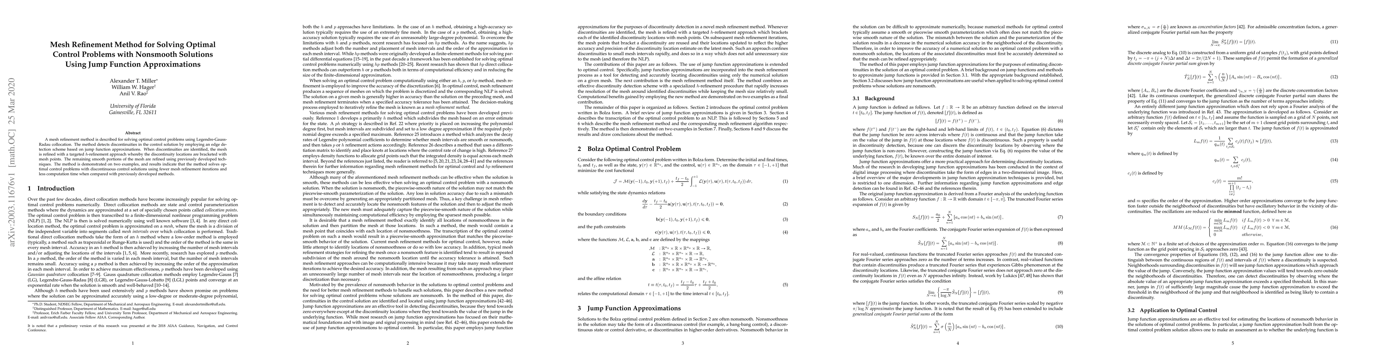 This paper proposes a mesh refinement method for optimal control problems using Legendre-Gauss-Radau collocation, which employs jump function approximations to detect discontinuities and refines the mesh accordingly. The method achieves more efficient solutions with fewer iterations and less computation time compared to existing techniques.