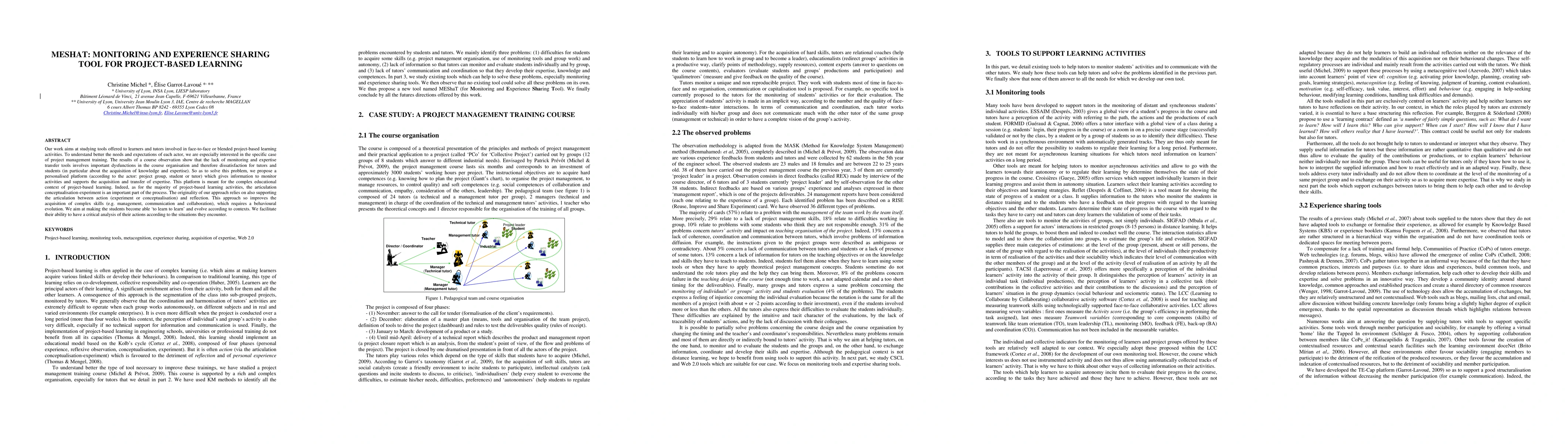 Our work aims at studying tools offered to learners and tutors involved in face-to-face or blended project-based learning activities. To understand better the needs and expectations of each actor, we are especially interested in the specific case of project management training. The results of a course observation show that the lack of monitoring and expertise transfer tools involves important dysfunctions in the course organisation and therefore dissatisfaction for tutors and students (in particular about the acquisition of knowledge and expertise). So as to solve this problem, we propose a personalised platform (according to the actor: project group, student or tutor) which gives information to monitor activities and supports the acquisition and transfer of expertise. This platform is meant for the complex educational context of project-based learning. Indeed, as for the majority of project-based learning activities, the articulation conceptualisation-experiment is an important part of the process. The originality of our approach relies on also supporting the articulation between action (experiment or conceptualisation) and reflection. This approach so improves the acquisition of complex skills (e.g. management, communication and collaboration), which requires a behavioural evolution. We aim at making the students become able ?to learn to learn' and evolve according to contexts. We facilitate their ability to have a critical analysis of their actions according to the situations they encounter.