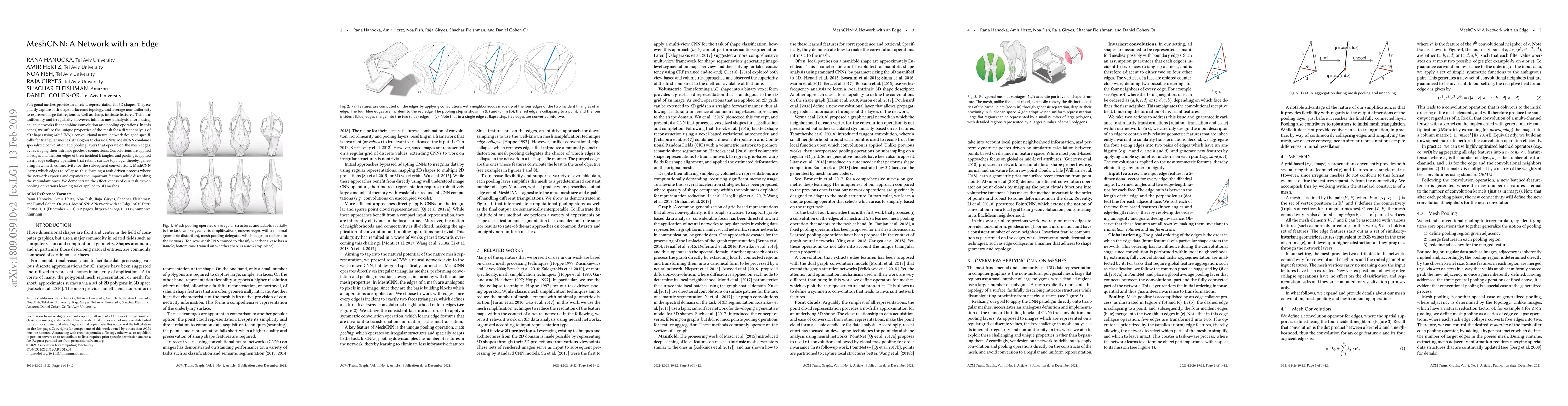 Polygonal meshes provide an efficient representation for 3D shapes. They explicitly capture both shape surface and topology, and leverage non-uniformity to represent large flat regions as well as sharp, intricate features. This non-uniformity and irregularity, however, inhibits mesh analysis efforts using neural networks that combine convolution and pooling operations. In this paper, we utilize the unique properties of the mesh for a direct analysis of 3D shapes using MeshCNN, a convolutional neural network designed specifically for triangular meshes. Analogous to classic CNNs, MeshCNN combines specialized convolution and pooling layers that operate on the mesh edges, by leveraging their intrinsic geodesic connections. Convolutions are applied on edges and the four edges of their incident triangles, and pooling is applied via an edge collapse operation that retains surface topology, thereby, generating new mesh connectivity for the subsequent convolutions. MeshCNN learns which edges to collapse, thus forming a task-driven process where the network exposes and expands the important features while discarding the redundant ones. We demonstrate the effectiveness of our task-driven pooling on various learning tasks applied to 3D meshes.