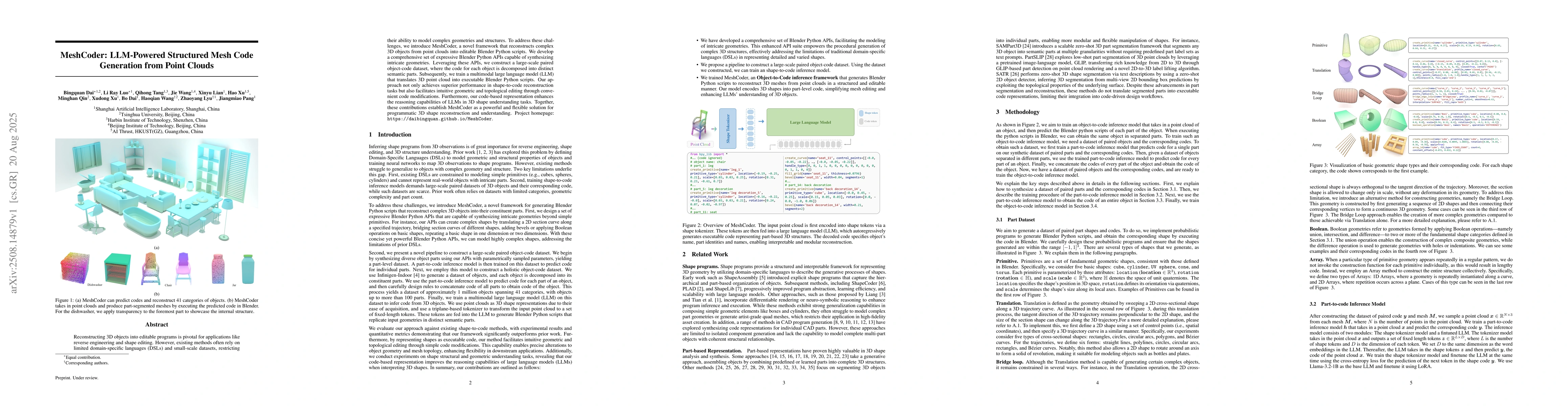 MeshCoder introduces a novel framework that reconstructs complex 3D objects from point clouds into editable Blender Python scripts. It leverages a comprehensive set of expressive Blender Python APIs and a large-scale paired object-code dataset to train a multimodal large language model (LLM) for translating 3D point clouds into executable Blender Python scripts.