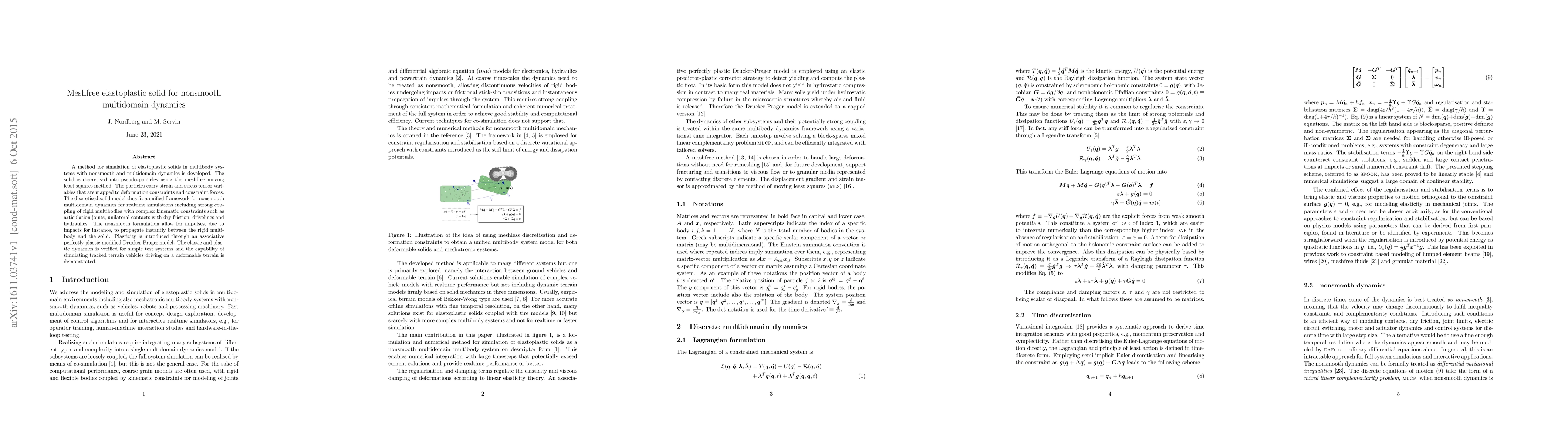 A method for simulation of elastoplastic solids in multibody systems with nonsmooth and multidomain dynamics is developed. The solid is discretised into pseudo-particles using the meshfree moving least squares method. The particles carry strain and stress tensor variables that are mapped to deformation constraints and constraint forces. The discretised solid model thus fit a unified framework for nonsmooth multidomain dynamics for realtime simulations including strong coupling of rigid multibodies with complex kinematic constraints such as articulation joints, unilateral contacts with dry friction, drivelines and hydraulics. The nonsmooth formulation allow for impulses, due to impacts for instance, to propagate instantly between the rigid multibody and the solid. Plasticity is introduced through an associative perfectly plastic modified Drucker-Prager model. The elastic and plastic dynamics is verified for simple test systems and the capability of simulating tracked terrain vehicles driving on a deformable terrain is demonstrated.