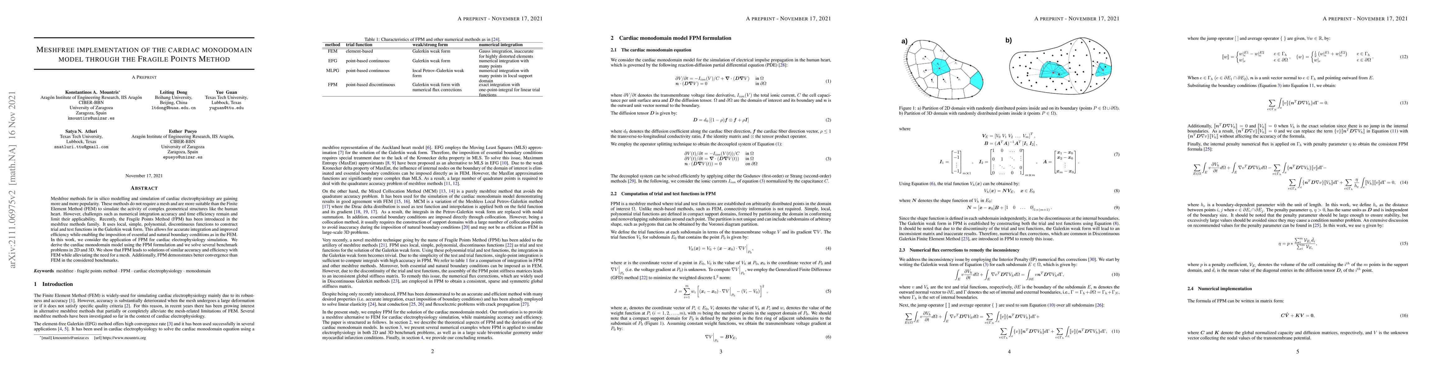 This research proposes the Fragile Points Method (FPM) for simulating cardiac electrophysiology without requiring a mesh, achieving similar accuracy and efficiency compared to the Finite Element Method (FEM). FPM uses local polynomial functions to improve integration and convergence, demonstrating better results in benchmark problems.