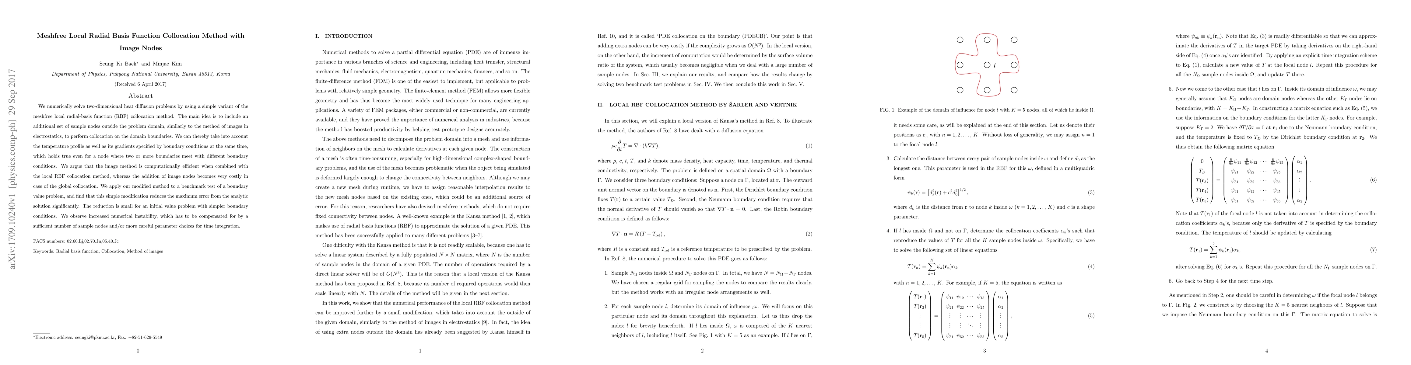 This paper proposes a meshfree local radial basis function collocation method enhanced with image nodes to solve two-dimensional heat diffusion problems, achieving significant error reduction and computational efficiency compared to global collocation methods. However, it notes increased numerical instability requiring careful parameter selection and sufficient sample nodes.