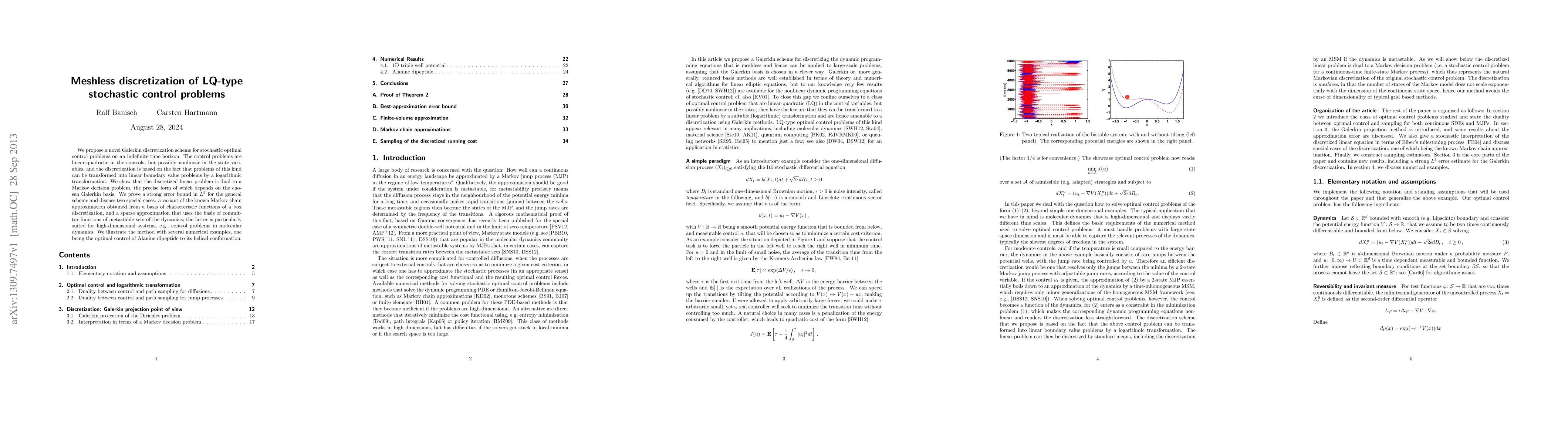 We propose a novel Galerkin discretization scheme for stochastic optimal control problems on an indefinite time horizon. The control problems are linear-quadratic in the controls, but possibly nonlinear in the state variables, and the discretization is based on the fact that problems of this kind can be transformed into linear boundary value problems by a logarithmic transformation. We show that the discretized linear problem is dual to a Markov decision problem, the precise form of which depends on the chosen Galerkin basis. We prove a strong error bound in $L^{2}$ for the general scheme and discuss two special cases: a variant of the known Markov chain approximation obtained from a basis of characteristic functions of a box discretization, and a sparse approximation that uses the basis of committor functions of metastable sets of the dynamics; the latter is particularly suited for high-dimensional systems, e.g., control problems in molecular dynamics. We illustrate the method with several numerical examples, one being the optimal control of Alanine dipeptide to its helical conformation.