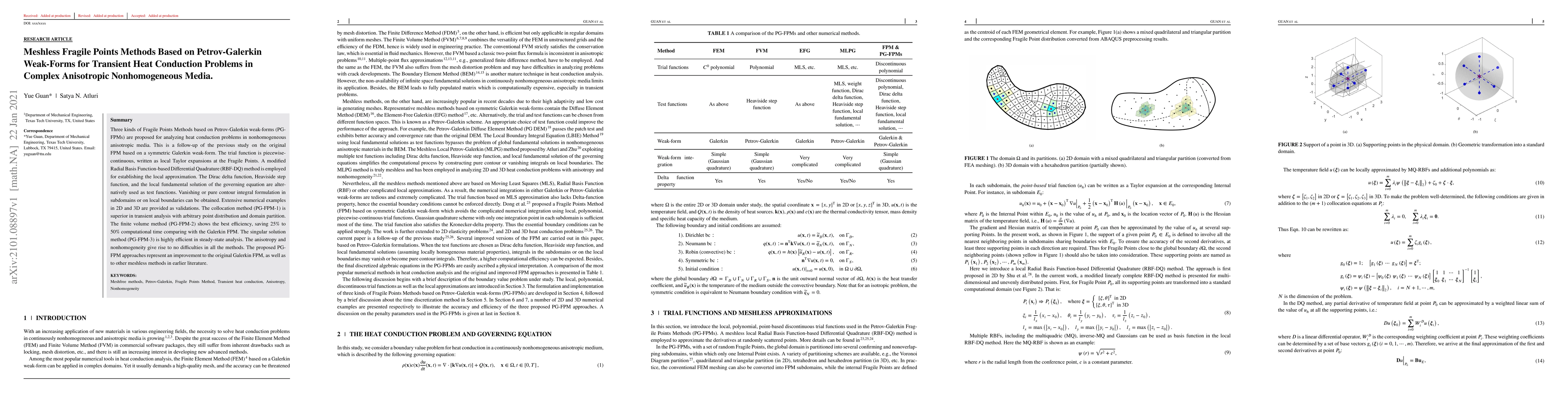 This paper proposes three meshless Fragile Points Methods based on Petrov-Galerkin weak-forms for transient heat conduction in complex anisotropic nonhomogeneous media. The methods show superior performance in transient analysis, efficiency, and steady-state analysis, outperforming the original Galerkin FPM and other meshless methods.