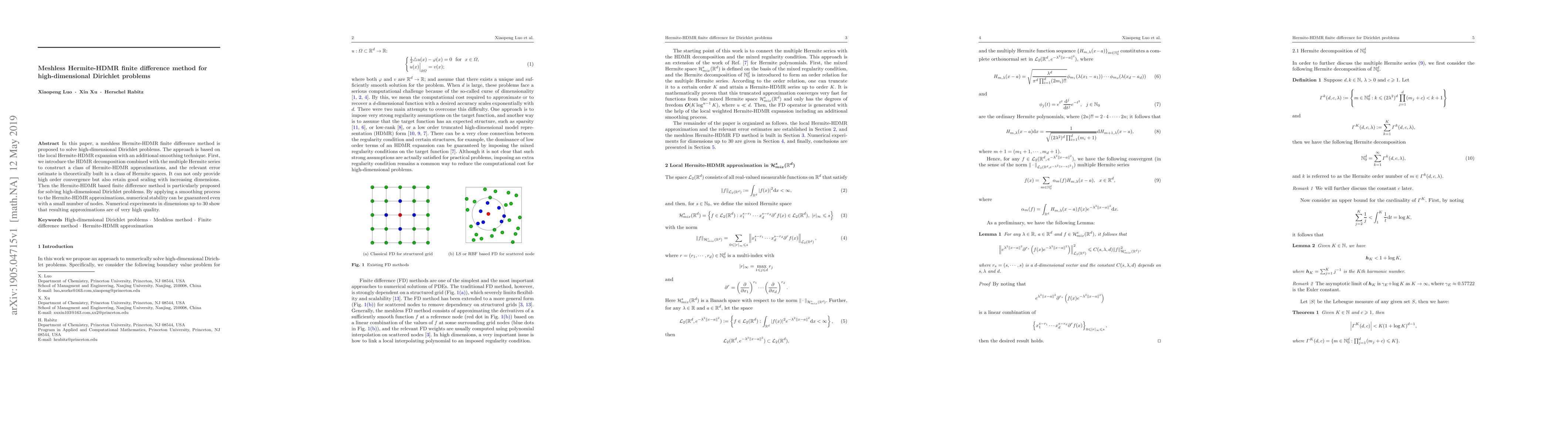 This paper proposes a meshless Hermite-HDMR finite difference method for high-dimensional Dirichlet problems, utilizing local Hermite-HDMR expansions and a smoothing technique to ensure numerical stability. The method demonstrates high-order convergence and maintains efficiency with increasing dimensions, as evidenced by high-quality approximations in experiments up to 30 dimensions.