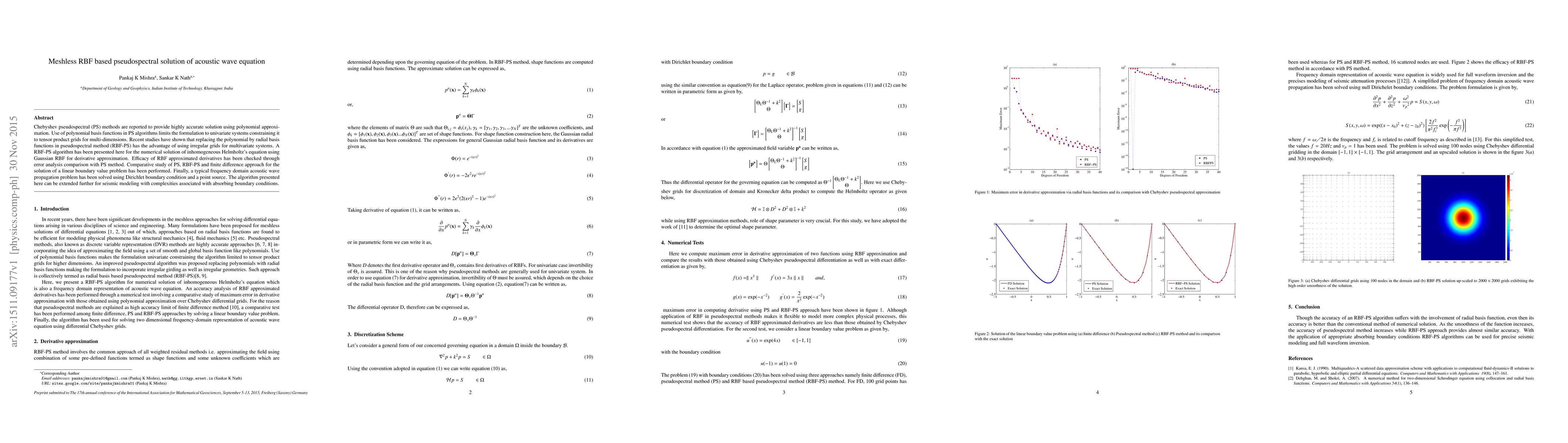 This paper proposes a meshless radial basis function (RBF) based pseudospectral method for solving the acoustic wave equation, replacing polynomial basis functions with Gaussian RBFs to allow for irregular grids in multivariate systems. The RBF-PS method is compared to traditional pseudospectral and finite difference methods, demonstrating its efficacy through error analysis and application to a frequency domain acoustic wave propagation problem.