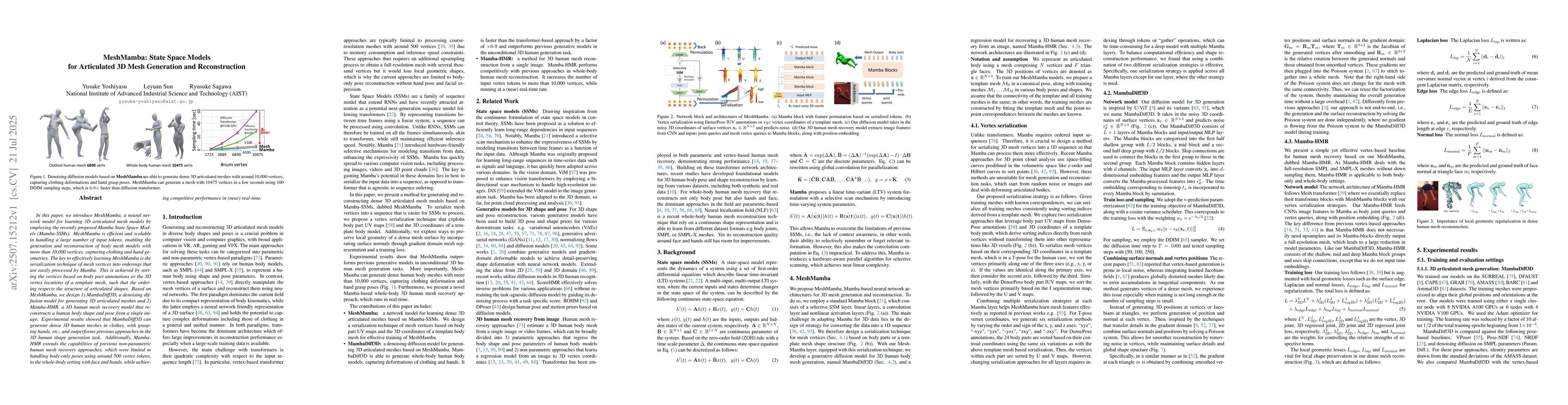 The research introduces MeshMamba, a neural network model that leverages Mamba State Space Models (Mamba-SSMs) for learning 3D articulated mesh models. It employs a serialization technique for mesh vertices based on body part annotations or 3D vertex locations of a template mesh, enabling efficient handling of large input tokens and generation/reconstruction of body mesh models with over 10,000 vertices.
