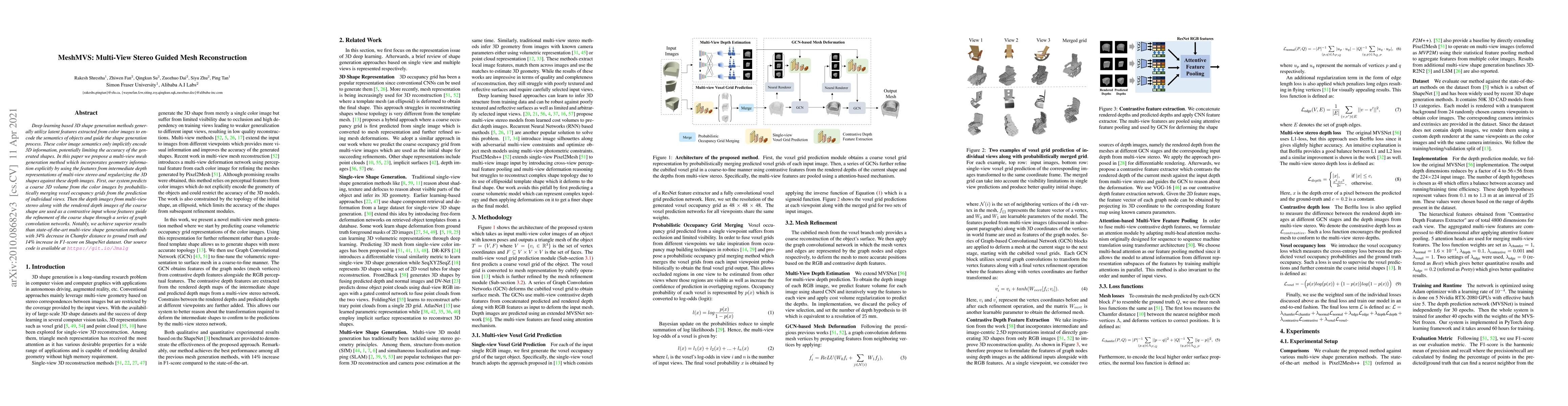 MeshMVS proposes a multi-view mesh generation method that explicitly incorporates geometry information from depth representations, refining 3D shapes through graph convolution networks. The method achieves superior accuracy, reducing Chamfer distance by 34% and increasing F1-score by 14% on the ShapeNet dataset.