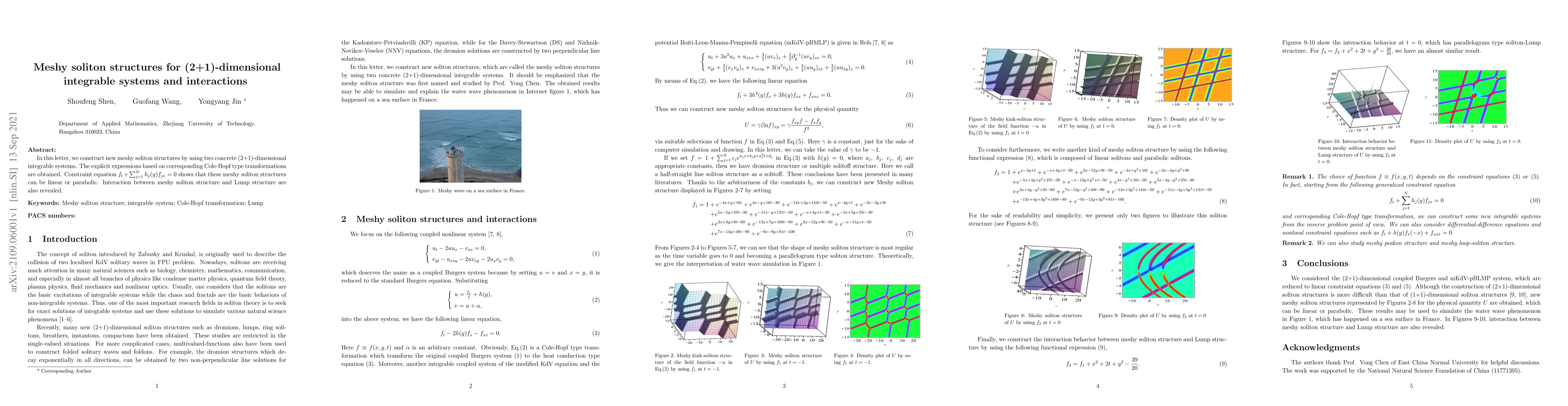 In this letter, we construct new meshy soliton structures by using two concrete (2+1)-dimensional integrable systems. The explicit expressions based on corresponding Cole-Hopf type transformations are obtained. Constraint equation ft+\sum_{j=1}^{N} h_j(y)f_{jx} = 0 shows that these meshy soliton structures can be linear or parabolic. Interaction between meshy soliton structure and Lump structure are also revealed.