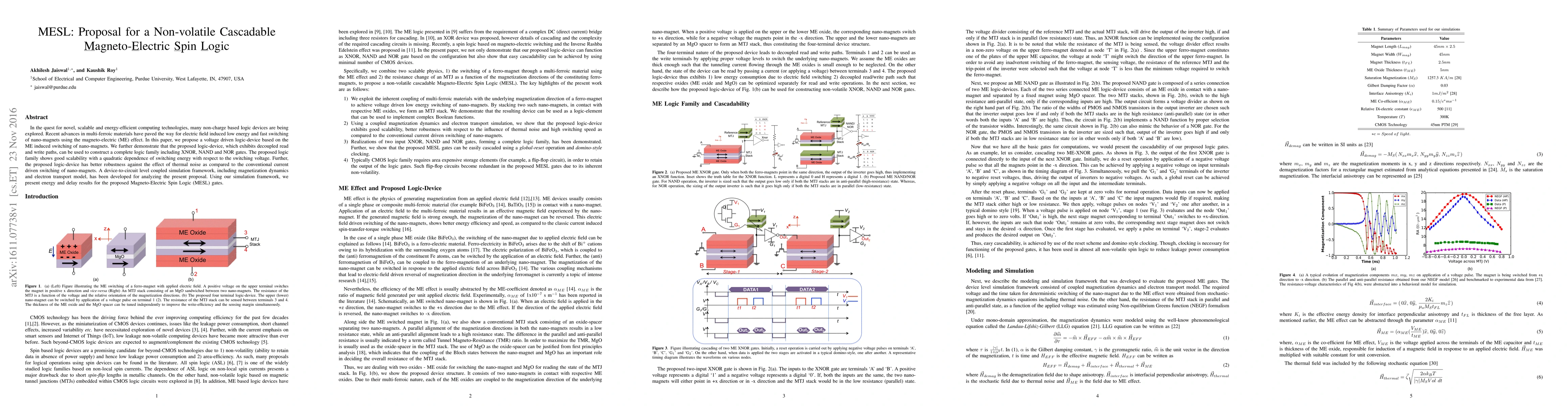 This paper proposes a non-volatile, energy-efficient Magneto-Electric Spin Logic (MESL) device based on electric field induced switching of nano-magnets, demonstrating scalability and robustness against thermal noise. The MESL logic family includes XNOR, NAND, and NOR gates, with a quadratic dependence on switching energy.