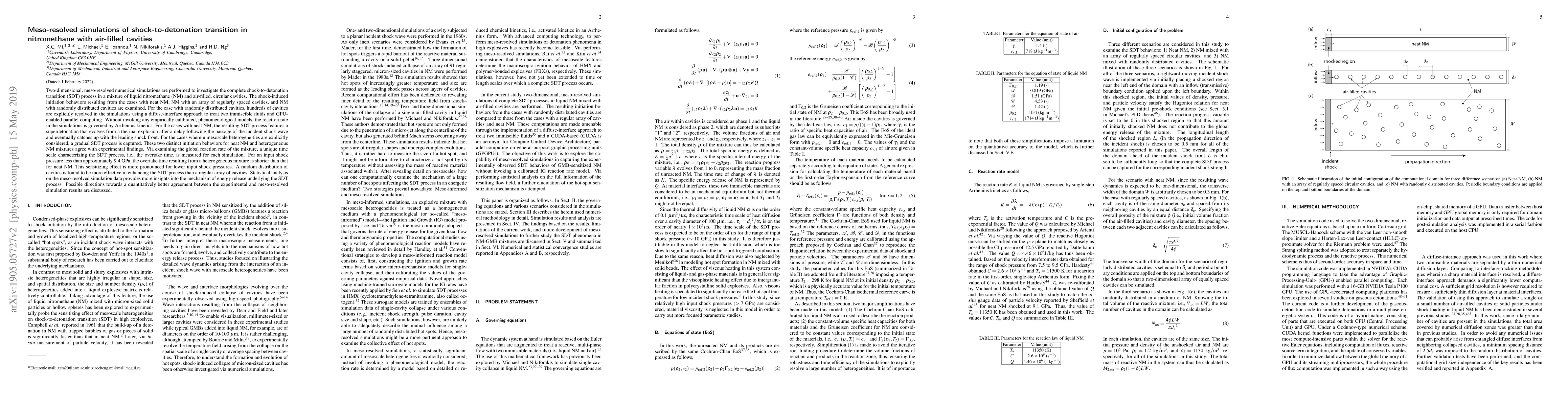 Two-dimensional, meso-resolved numerical simulations are performed to investigate the complete shock-to-detonation transition (SDT) process in a mixture of liquid nitromethane (NM) and air-filled, circular cavities. The shock-induced initiation behaviors resulting from the cases with neat NM, NM with an array of regularly spaced cavities, and NM with randomly distributed cavities are examined. For the case with randomly distributed cavities, hundreds of cavities are explicitly resolved in the simulations using a diffuse-interface approach to treat two immiscible fluids and GPU-enabled parallel computing. Without invoking any empirically calibrated, phenomenological models, the reaction rate in the simulations is governed by Arrhenius kinetics. For the cases with neat NM, the resulting SDT process features a superdetonation that evolves from a thermal explosion after a delay following the passage of the incident shock wave and eventually catches up with the leading shock front. For the cases wherein mesoscale heterogeneities are explicitly considered, a gradual SDT process is captured. These two distinct initiation behaviors for neat NM and heterogeneous NM mixtures agree with experimental findings. Via examining the global reaction rate of the mixture, a unique time scale characterizing the SDT process, i.e., the overtake time, is measured for each simulation. For an input shock pressure less than approximately $9.4~\mathrm{GPa}$, the overtake time resulting from a heterogeneous mixture is shorter than that for neat NM. This sensitizing effect is more pronounced for lower input shock pressures. A random distribution of cavities is found to be more effective in enhancing the SDT process than a regular array of cavities. Statistical analysis on the meso-resolved simulation data provides more insights into the mechanism of energy release underlying the SDT process.