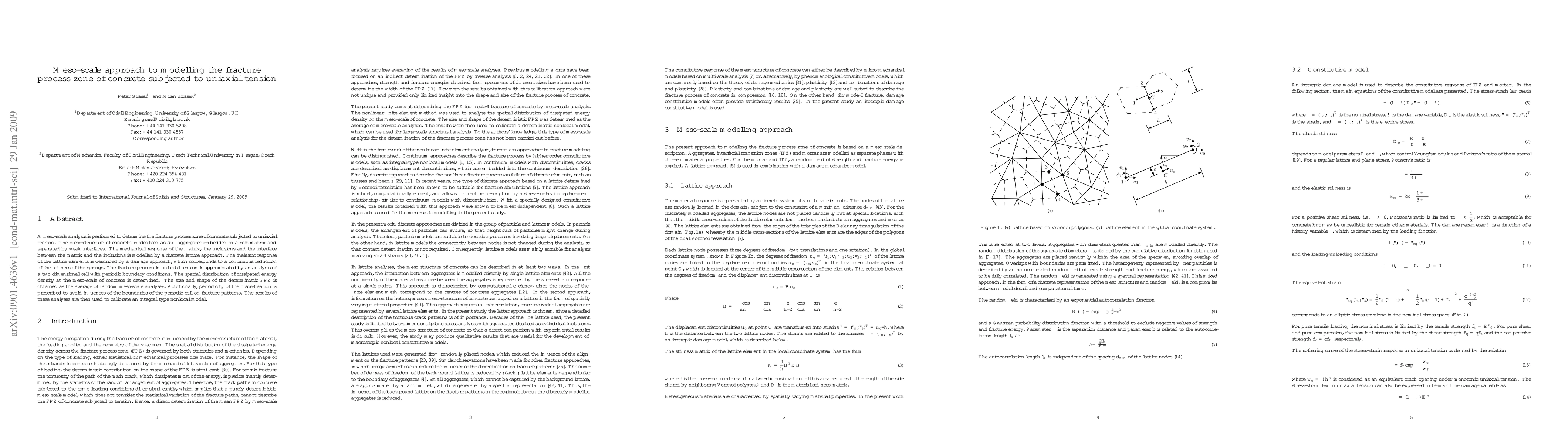 A meso-scale analysis is performed to determine the fracture process zone of concrete subjected to uniaxial tension. The meso-structure of concrete is idealised as stiff aggregates embedded in a soft matrix and separated by weak interfaces. The mechanical response of the matrix, the inclusions and the interface between the matrix and the inclusions is modelled by a discrete lattice approach. The inelastic response of the lattice elements is described by a damage approach, which corresponds to a continuous reduction of the stiffness of the springs. The fracture process in uniaxial tension is approximated by an analysis of a two-dimensional cell with periodic boundary conditions. The spatial distribution of dissipated energy density at the meso-scale of concrete is determined. The size and shape of the deterministic FPZ is obtained as the average of random meso-scale analyses. Additionally, periodicity of the discretisation is prescribed to avoid influences of the boundaries of the periodic cell on fracture patterns. The results of these analyses are then used to calibrate an integral-type nonlocal model.