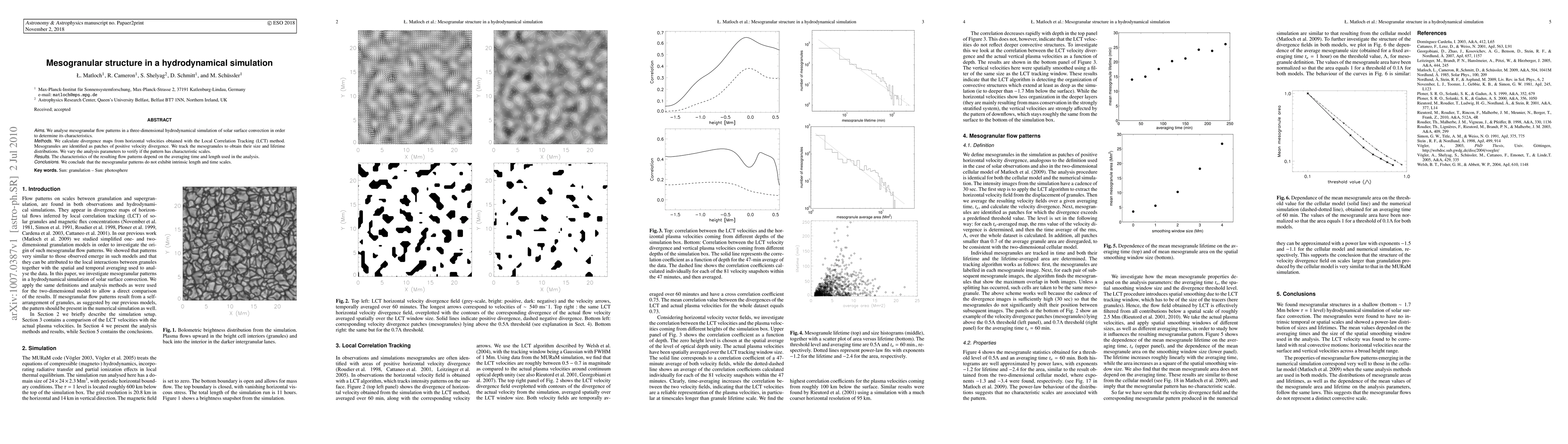 We analyse mesogranular flow patterns in a three-dimensional hydrodynamical simulation of solar surface convection in order to determine its characteristics. We calculate divergence maps from horizontal velocities obtained with the Local Correlation Tracking (LCT) method. Mesogranules are identified as patches of positive velocity divergence. We track the mesogranules to obtain their size and lifetime distributions. We vary the analysis parameters to verify if the pattern has characteristic scales. The characteristics of the resulting flow patterns depend on the averaging time and length used in the analysis. We conclude that the mesogranular patterns do not exhibit intrinsic length and time scales.