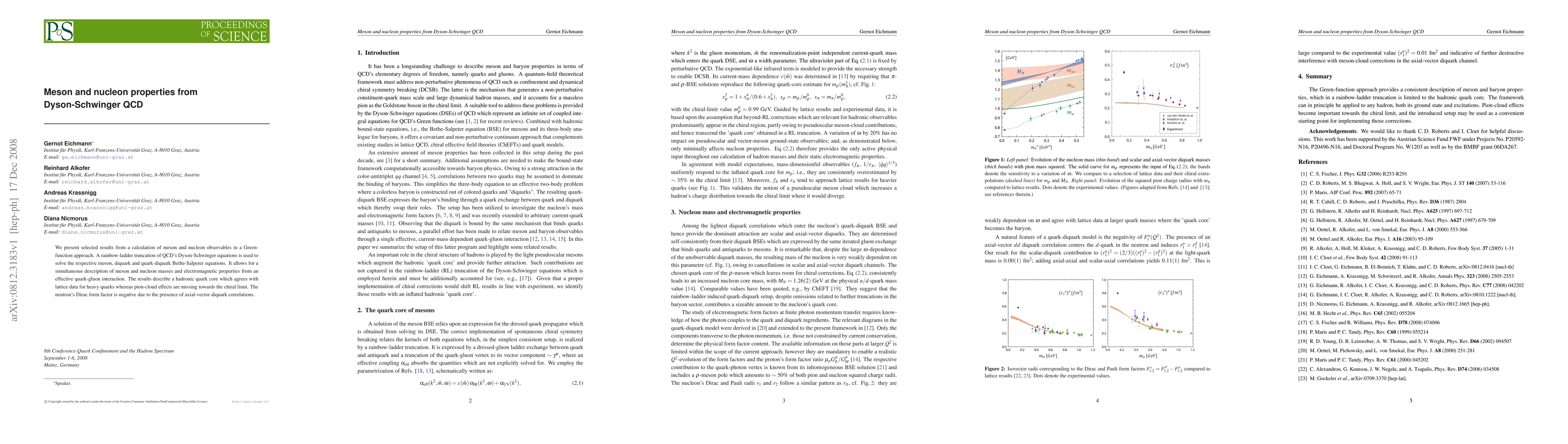 This paper uses QCD's Dyson-Schwinger equations to calculate meson and nucleon properties, revealing a hadronic quark core consistent with heavy quark data but lacking pion-cloud effects near the chiral limit. The neutron's Dirac form factor is negative, attributed to axial-vector diquark correlations.