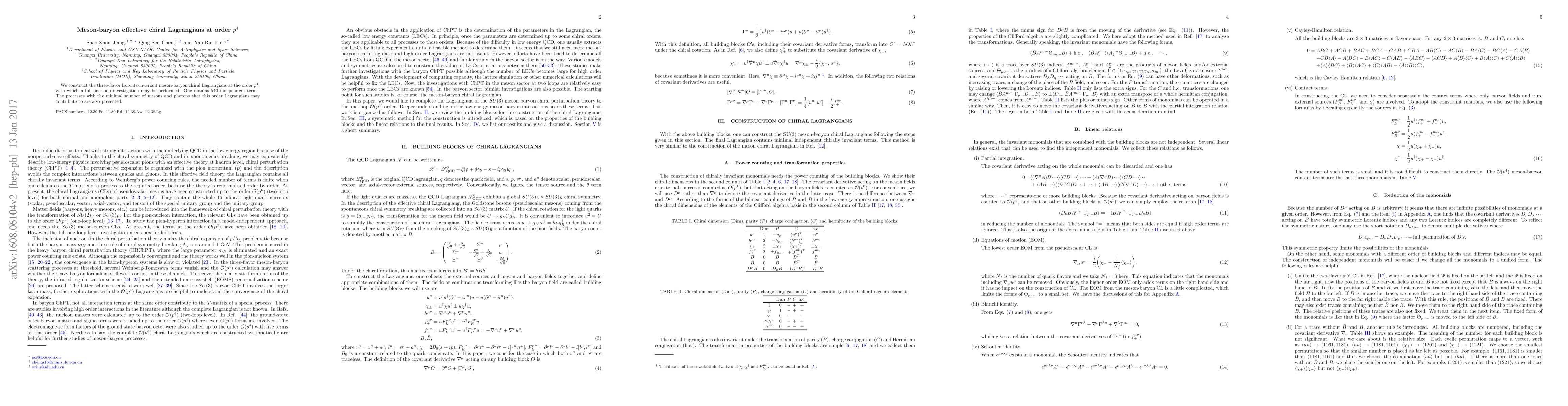 This paper constructs a three-flavor meson-baryon chiral Lagrangian at order $p^4$, yielding 540 independent terms, enabling full one-loop investigations. It also outlines the minimal processes involving mesons and photons that this Lagrangian can describe.