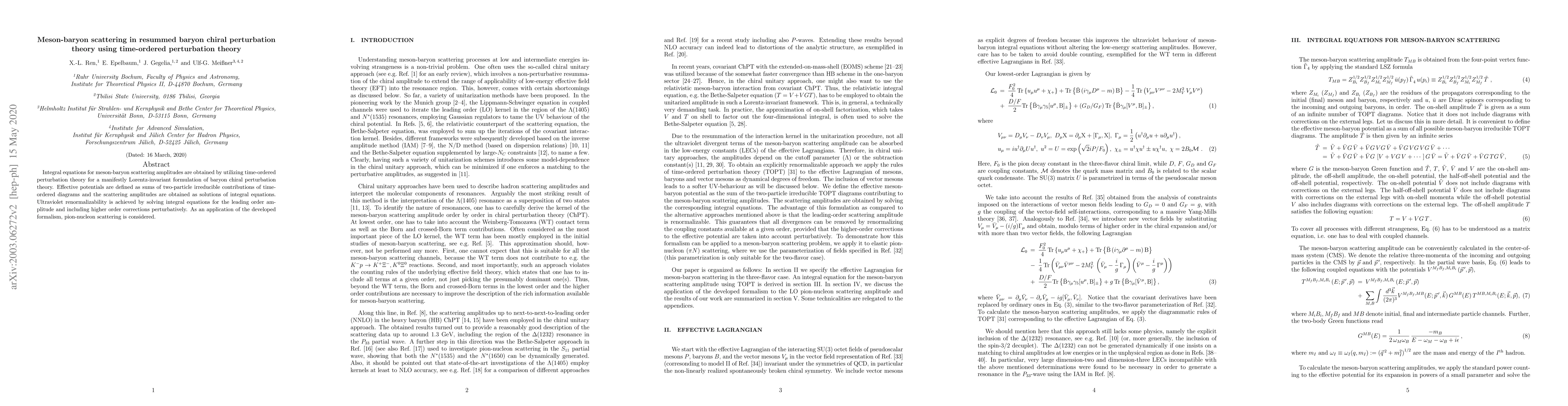 This paper develops a resummed baryon chiral perturbation theory using time-ordered perturbation theory to derive integral equations for meson-baryon scattering amplitudes, achieving ultraviolet renormalizability. An application to pion-nucleon scattering is provided to demonstrate the effectiveness of the new formalism.