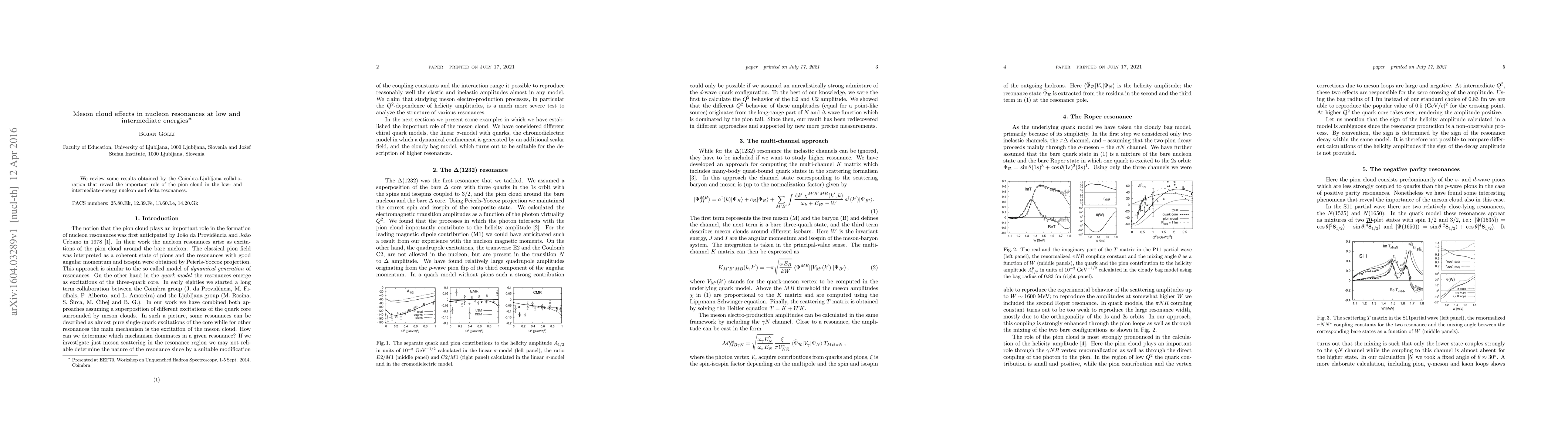 Summary: This review highlights findings from the Coimbra-Ljubljana collaboration demonstrating the significant influence of the pion cloud on nucleon and delta resonances at low and intermediate energies. The study underscores the crucial role of meson cloud effects in understanding nucleon resonances.