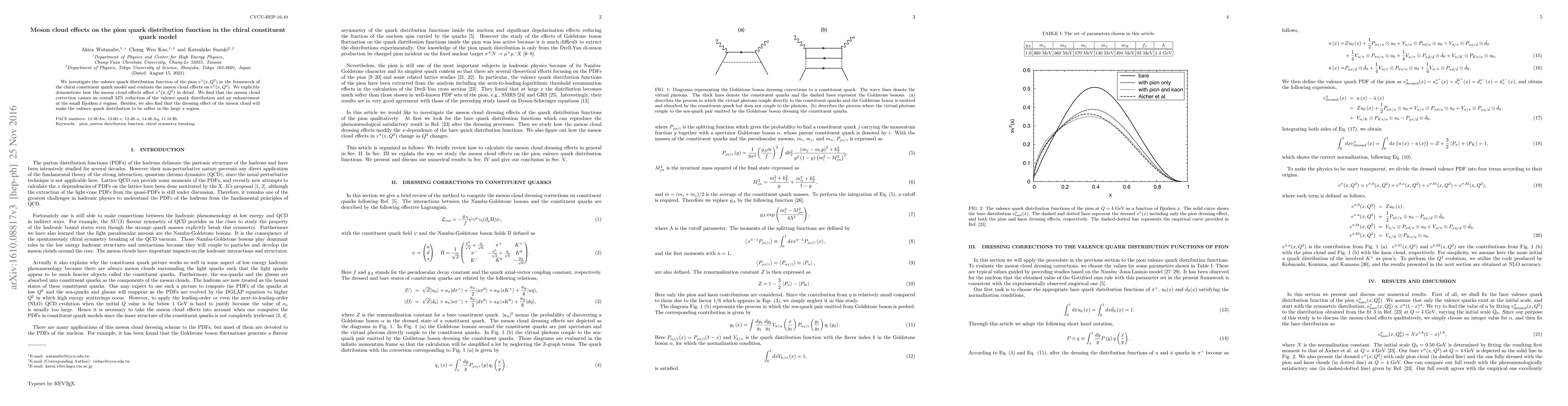 Researchers used a chiral constituent quark model to study pion quark distribution functions with meson cloud effects, finding a 32% reduction in valence quarks at small Bjorken x and softer distributions at large x.
