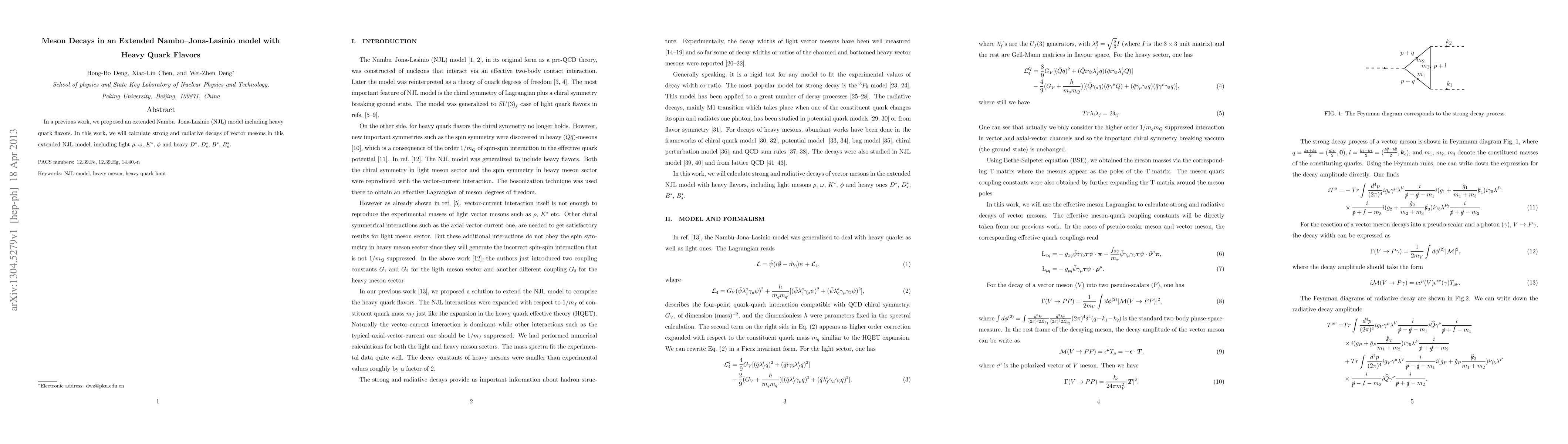 In a previous work, we proposed an extended Nambu--Jona-Lasinio (NJL) model including heavy quark flavors. In this work, we will calculate strong and radiative decays of vector mesons in this extended NJL model, including light $\rho$, $\omega$, $K^*$, $\phi$ and heavy $D^*$, $D^*_s$, $B^*$, $B^*_s$.