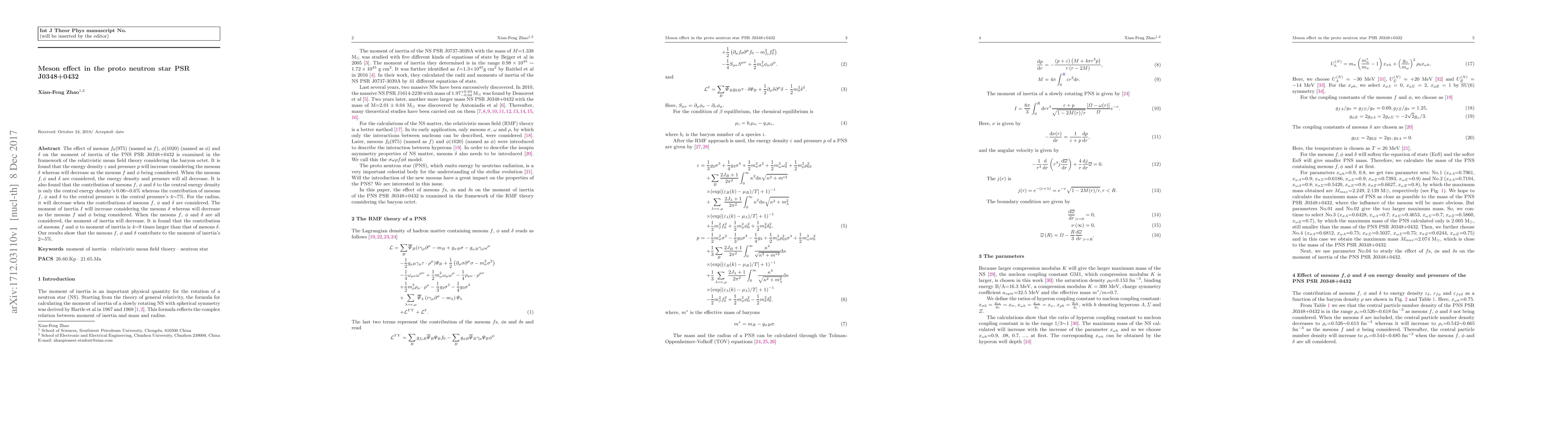 The effect of mesons $f_{0}(975)$ (named as $f$), $\phi(1020)$ (named as $\phi$) and $\delta$ on the moment of inertia of the PNS PSR J0348+0432 is examined in the framework of the relativistic mean field theory considering the baryon octet. It is found that the energy density $\varepsilon$ and pressure $p$ will increase considering the mesons $\delta$ whereas will decrease as the mesons $f$ and $\phi$ being considered. When the mesons $f, \phi$ and $\delta$ are considered, the energy density and pressure will all decrease. It is also found that the contribution of mesons $f$, $\phi$ and $\delta$ to the central energy density is only the central energy density's 0.06$\sim$0.6\% whereas the contribution of mesons $f$, $\phi$ and $\delta$ to the central pressure is the central pressure's 4$\sim$7\%. For the radius, it will decrease when the contributions of mesons $f$, $\phi$ and $\delta$ are considered. The moment of inertia $I$ will increase considering the mesons $\delta$ whereas will decrease as the mesons $f$ and $\phi$ being considered. When the mesons $f$, $\phi$ and $\delta$ are all considered, the moment of inertia will decrease. It is found that the contribution of mesons $f$ and $\phi$ to moment of inertia is 4$\sim$9 times larger than that of mesons $\delta$. Our results show that the mesons $f$, $ \phi$ and $\delta$ contribute to the moment of inertia's 2$\sim$5\%.
