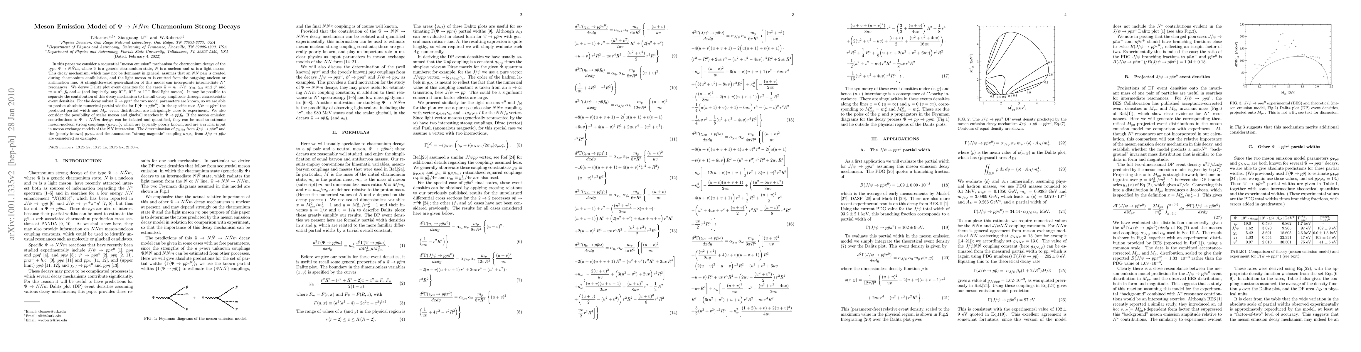 This paper explores a "meson emission" mechanism for charmonium decays of the type Ψ → N N̅ m, predicting Dalitz plot event densities and partial widths for various charmonium states and light mesons. It suggests that this decay mechanism could help isolate contributions to the full decay amplitude and estimate poorly known meson-nucleon strong couplings.