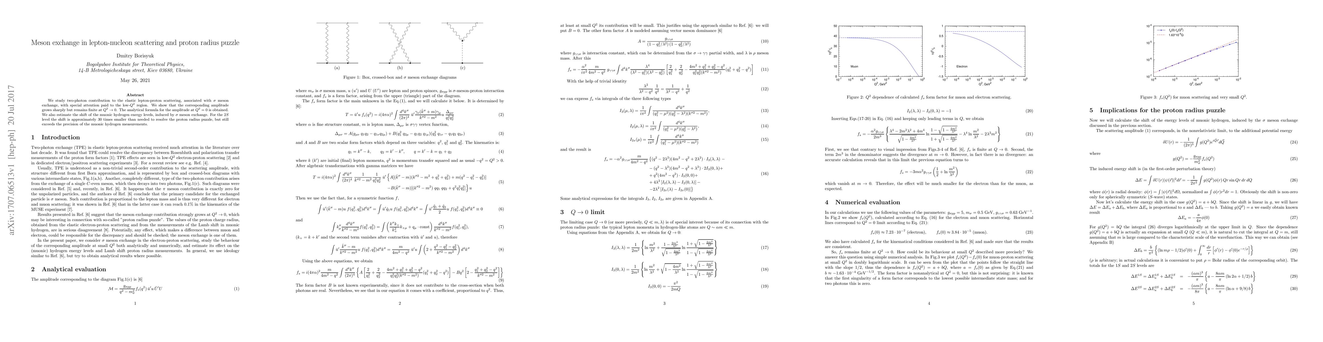 We study two-photon contribution to the elastic lepton-proton scattering, associated with sigma meson exchange, with special attention paid to the low-Q2 region. We show that the corresponding amplitude grows sharply but remains finite at Q2->0. The analytical formula for the amplitude at Q2=0 is obtained. We also estimate the shift of the muonic hydrogen energy levels, induced by sigma meson exchange. For the 2S level the shift is approximately 30 times smaller than needed to resolve the proton radius puzzle, but still exceeds the precision of the muonic hydrogen measurements.