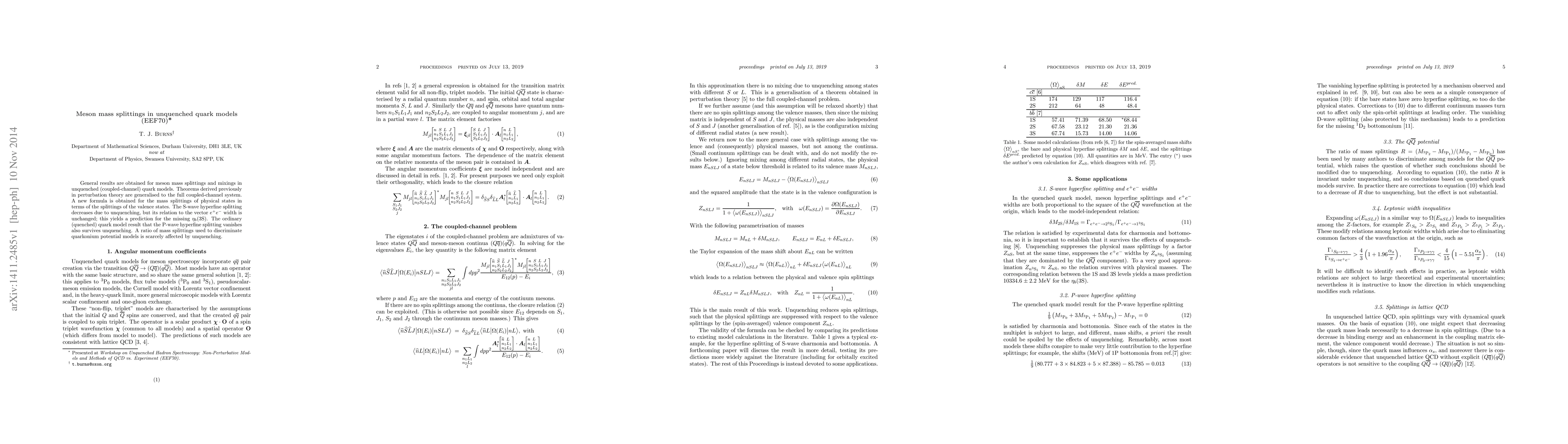 General results are obtained for meson mass splittings and mixings in unquenched (coupled-channel) quark models. Theorems derived previously in perturbation theory are generalised to the full coupled-channel system. A new formula is obtained for the mass splittings of physical states in terms of the splittings of the valence states. The S-wave hyperfine splitting decreases due to unquenching, but its relation to the vector $e^+e^-$ width is unchanged; this yields a prediction for the missing $\eta_b(3S)$. The ordinary (quenched) quark model result that the P-wave hyperfine splitting vanishes also survives unquenching. A ratio of mass splittings used to discriminate quarkonium potential models is scarcely affected by unquenching.