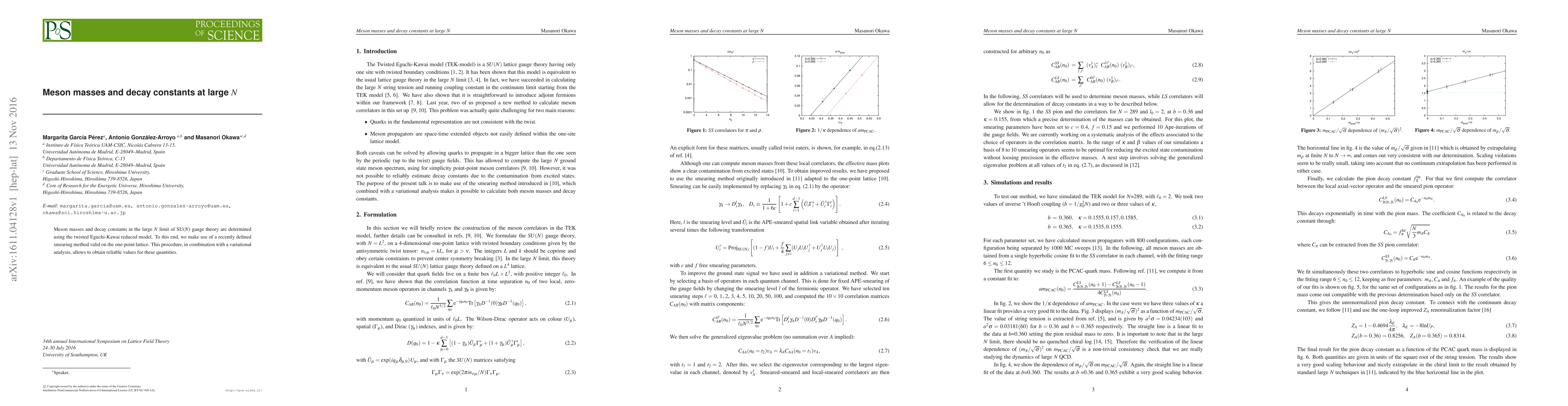 This paper determines meson masses and decay constants in the large $N$ limit of SU($N$) gauge theory using the twisted Eguchi-Kawai reduced model and a new smearing method on the lattice, achieving reliable results through variational analysis.