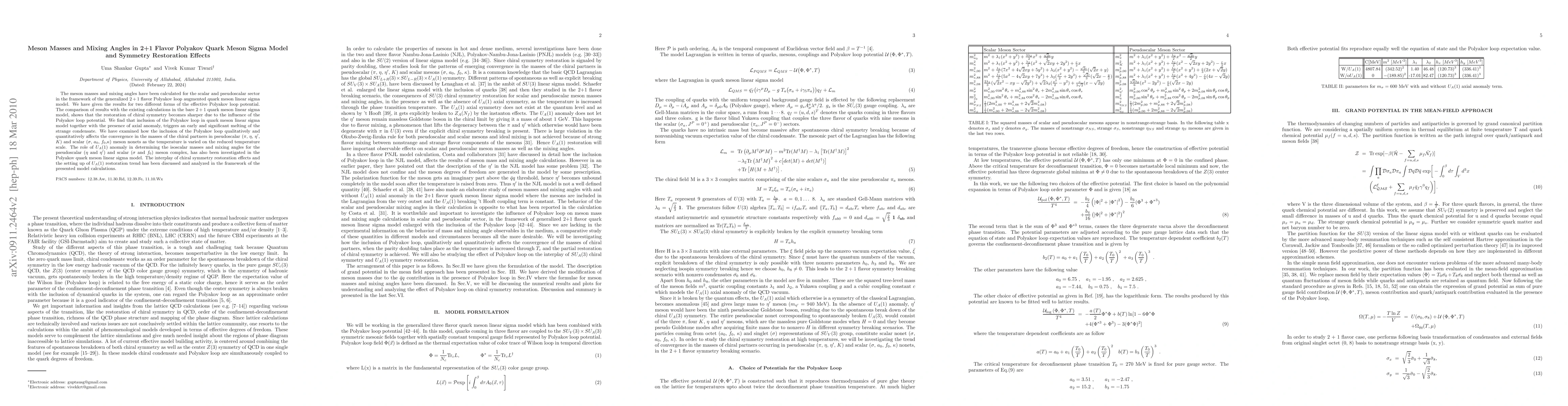 This paper calculates meson masses and mixing angles in the 2+1 flavor Polyakov loop augmented quark meson linear sigma model, showing that chiral symmetry restoration is sharper due to the Polyakov loop potential. It also investigates the impact of the Polyakov loop on the convergence of meson masses and the role of $U_A(1)$ anomaly in determining isoscalar masses and mixing angles, highlighting the interplay between chiral symmetry restoration and $U_A(1)$ restoration.