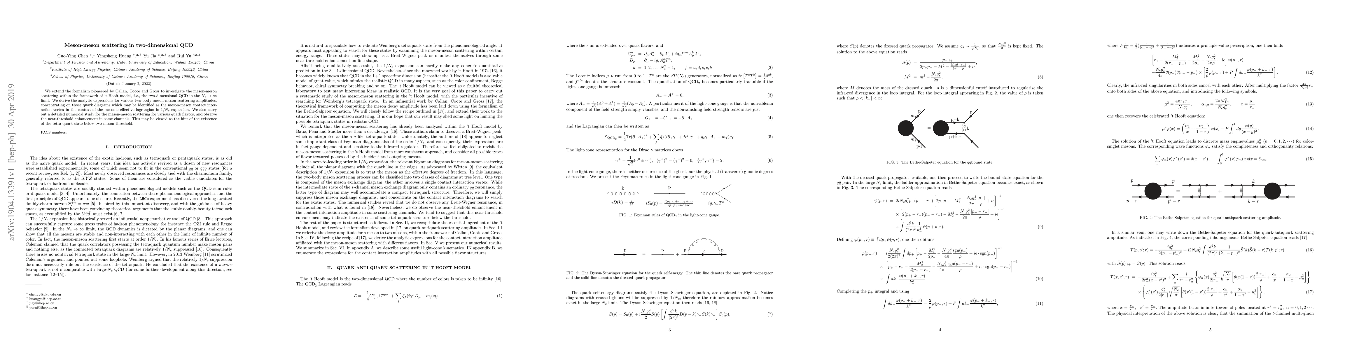 Researchers studied meson-meson scattering in a 2D quantum chromodynamics framework, discovering near-threshold enhancements that hint at the existence of tetra-quark states.