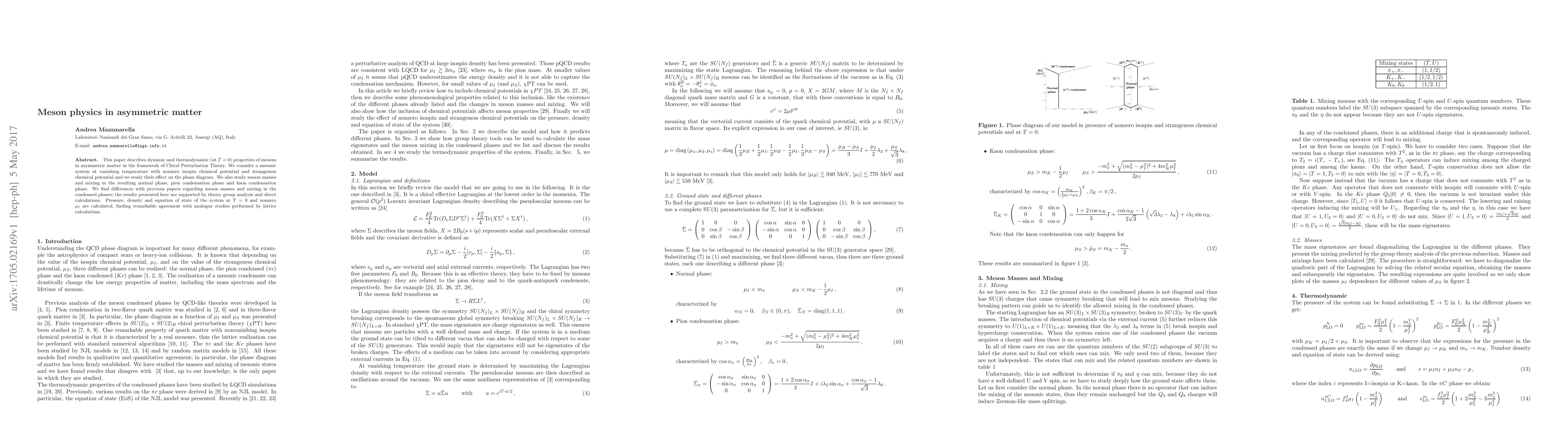 This paper describes dynamic and thermodynamic (at $T=0$) properties of mesons in asymmetric matter in the framework of Chiral Perturbation Theory. We consider a mesonic system at vanishing temperature with nonzero isospin chemical potential and strangeness chemical potential and we study their effect on the phase diagram. We also study meson masses and mixing in the resulting normal phase, pion condensation phase and kaon condensation phase. We find differences with previous papers regarding meson masses and mixing in the condensed phases; the results presented here are supported by theory group analysis and direct calculations. Pressure, density and equation of state of the system at $T=0$ and nonzero $\mu_I$ are calculated, finding remarkable agreement with analogue studies performed by lattice calculations.