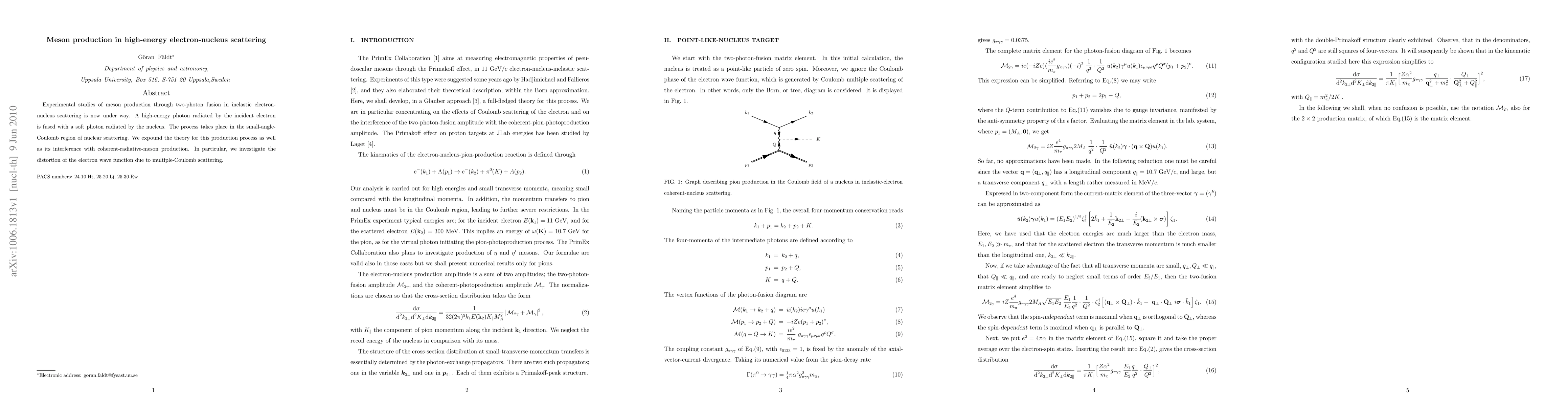 This paper explores the theoretical framework for meson production via two-photon fusion in high-energy electron-nucleus scattering, focusing on the interaction between photons radiated by the electron and the nucleus, and the interference effects with coherent-radiative-meson production, including the impact of multiple-Coulomb scattering on the electron wave function.