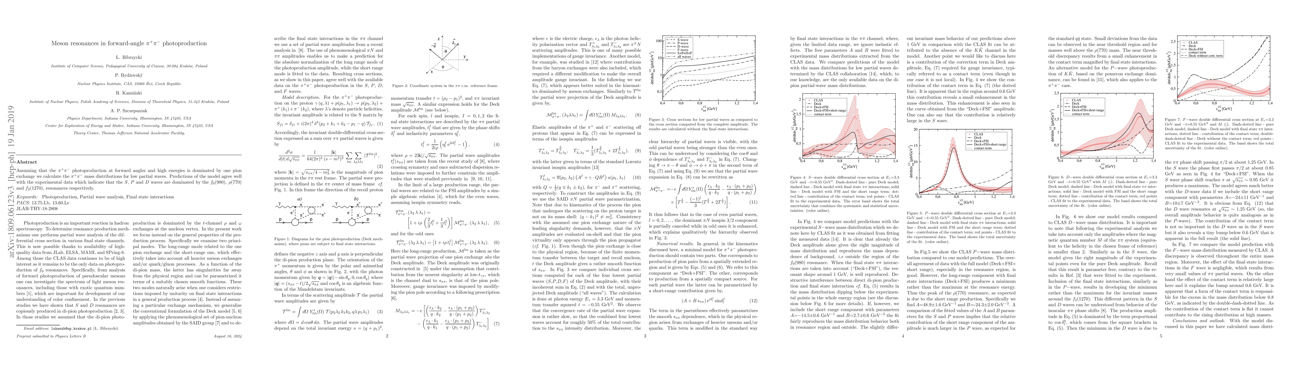 Assuming that the $\pi^+\pi^-$ photoproduction at forward angles and high energies is dominated by one pion exchange we calculate the $\pi^+\pi^-$ mass distributions for low partial waves. Predictions of the model agree well Assuming that the $\pi^+\pi^-$ photoproduction at forward angles and high energies is dominated by one pion exchange we calculate the $\pi^+\pi^-$ mass distributions for low partial waves. Predictions of the model agree well with the experimental data which indicate that the $S$, $P$ and $D$ waves are dominated by the $f_0(980)$, $\rho(770)$ and $f_2(1270)$, resonances respectively.