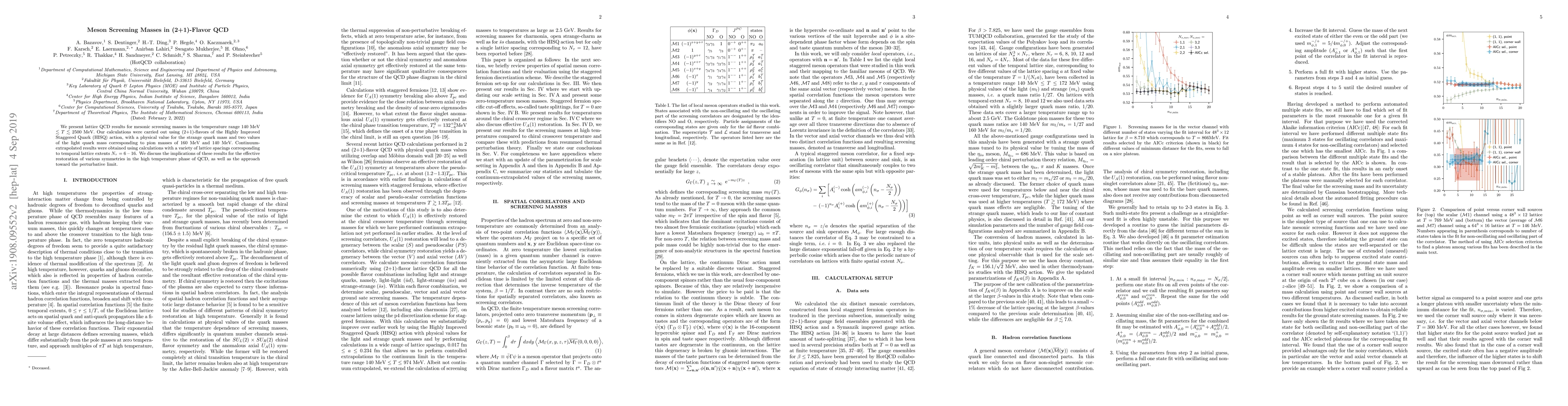The paper presents a thorough lattice QCD analysis of mesonic screening masses using HISQ action, demonstrating advanced techniques for continuum extrapolation and systematic error reduction.