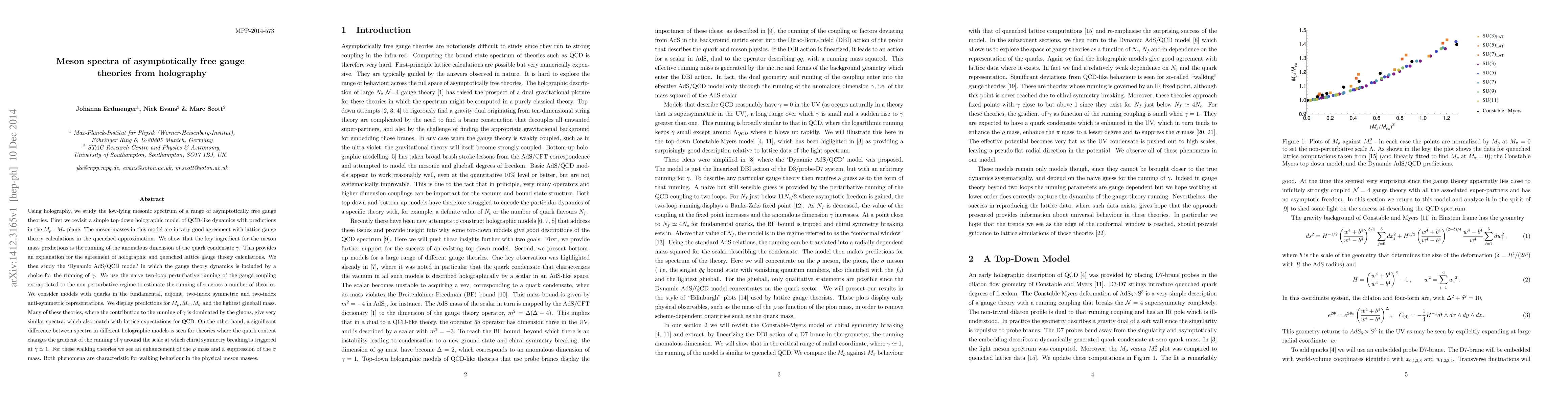Using holography, we study the low-lying mesonic spectrum of a range of asymptotically free gauge theories. First we revisit a simple top-down holographic model of QCD-like dynamics with predictions in the M_rho-M_pi plane. The meson masses in this model are in very good agreement with lattice gauge theory calculations in the quenched approximation. We show that the key ingredient for the meson mass predictions is the running of the anomalous dimension of the quark condensate, gamma. This provides an explanation for the agreement of holographic and quenched lattice gauge theory calculations. We then study the `Dynamic AdS/QCD model' in which the gauge theory dynamics is included by a choice for the running of gamma. We use the naive two-loop perturbative running of the gauge coupling extrapolated to the non-perturbative regime to estimate the running of gamma across a number of theories. We consider models with quarks in the fundamental, adjoint, two-index symmetric and two-index anti-symmetric representations. We display predictions for M_rho, M_pi, M_sigma and the lightest glueball mass. Many of these theories, where the contribution to the running of gamma is dominated by the gluons, give very similar spectra, which also match with lattice expectations for QCD. On the other hand, a significant difference between spectra in different holographic models is seen for theories where the quark content changes the gradient of the running of gamma around the scale at which chiral symmetry breaking is triggered at gamma approximately 1. For these walking theories we see an enhancement of the rho-mass and a suppression of the sigma-mass. Both phenomena are characteristic for walking behaviour in the physical meson masses.