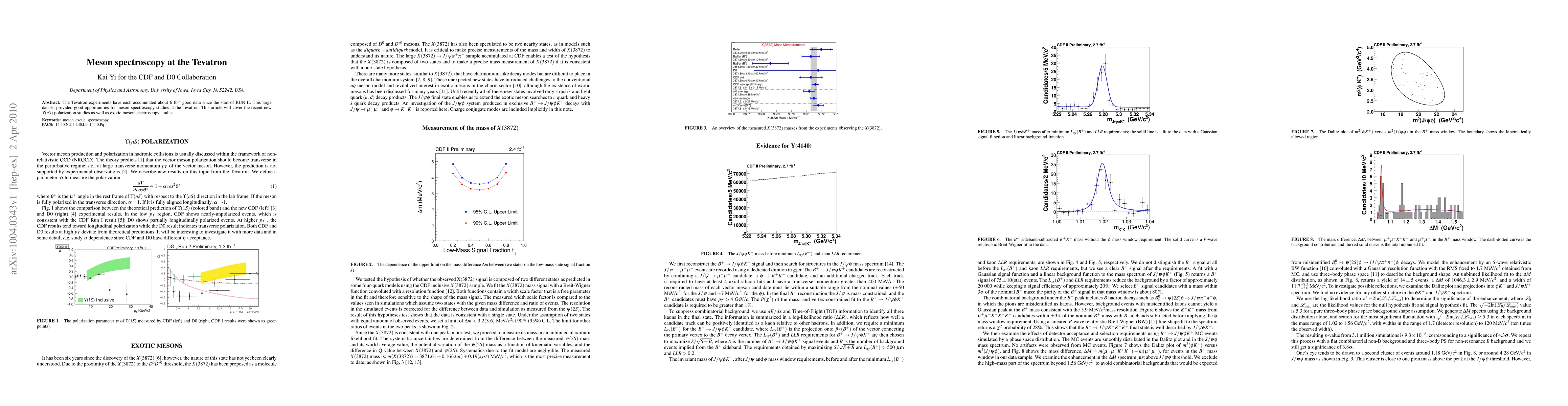 Summary: The Tevatron experiments have generated substantial data for meson spectroscopy, focusing on new polarization studies of $\Upsilon(nS)$ states and investigations into exotic mesons. These studies leverage the large dataset collected since the start of RUN II.