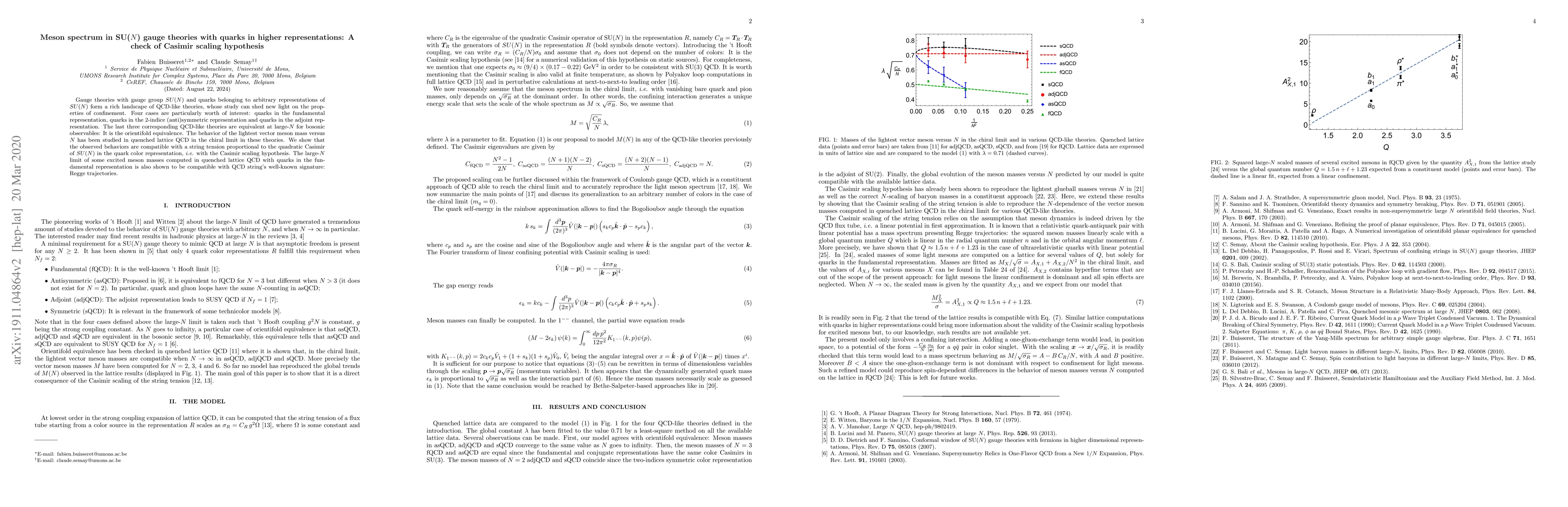 This paper investigates the meson spectrum in $SU(N)$ gauge theories with quarks in higher representations, confirming the Casimir scaling hypothesis for the string tension in these theories. The study shows that the behavior of meson masses aligns with predictions based on the quadratic Casimir of the quark's color representation, supporting the equivalence of QCD-like theories at large-$N$.