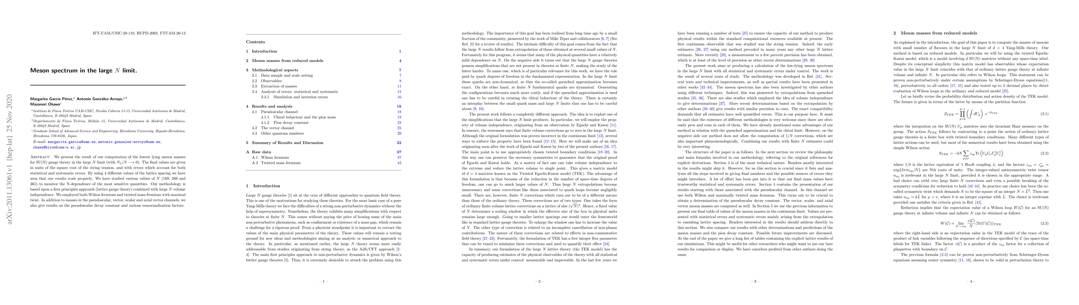 We present the result of our computation of the lowest lying meson masses for SU(N) gauge theory in the large $N$ limit (with $N_f/N\longrightarrow 0$). The final values are given in units of the square root of the string tension, and with errors which account for both statistical and systematic errors. By using 4 different values of the lattice spacing we have seen that our results scale properly. We have studied various values of $N$ (169, 289 and 361) to monitor the N-dependence of the most sensitive quantities. Our methodology is based upon a first principles approach (lattice gauge theory) combined with large $N$ volume independence. We employed both Wilson fermions and twisted mass fermions with maximal twist. In addition to masses in the pseudoscalar, vector, scalar and axial vector channels, we also give results on the pseudoscalar decay constant and various remormalization factors.