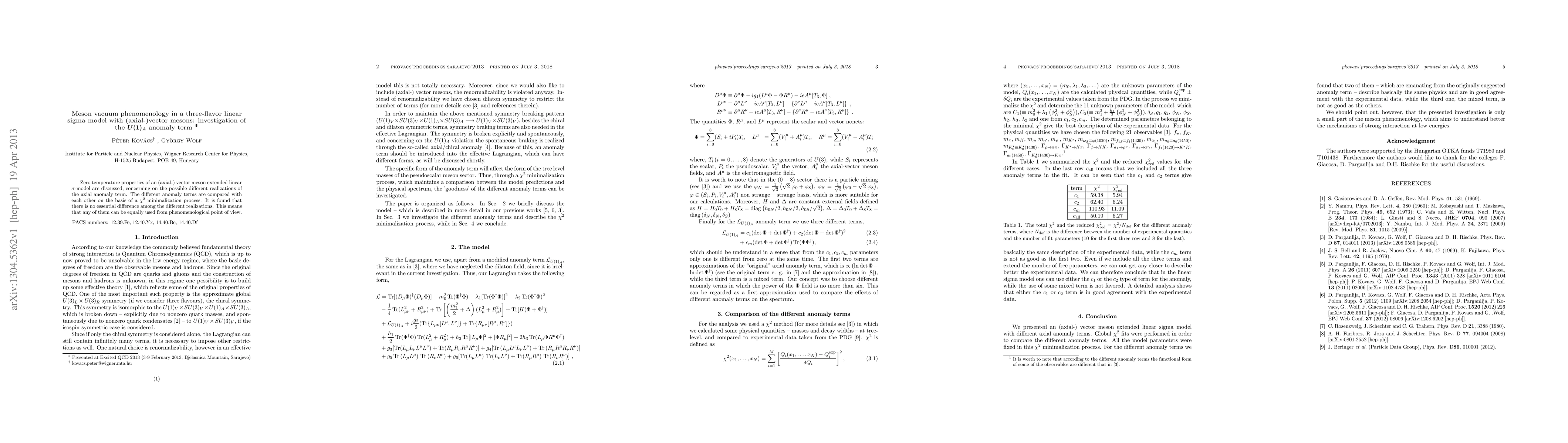 Zero temperature properties of an (axial-) vector meson extended linear sigma model are discussed, concerning on the possible different realizations of the axial anomaly term. The different anomaly terms are compared with each other on the basis of a chi^2 minimalization process. It is found that there is no essential difference among the different realizations. This means that any of them can be equally used from phenomenological point of view.