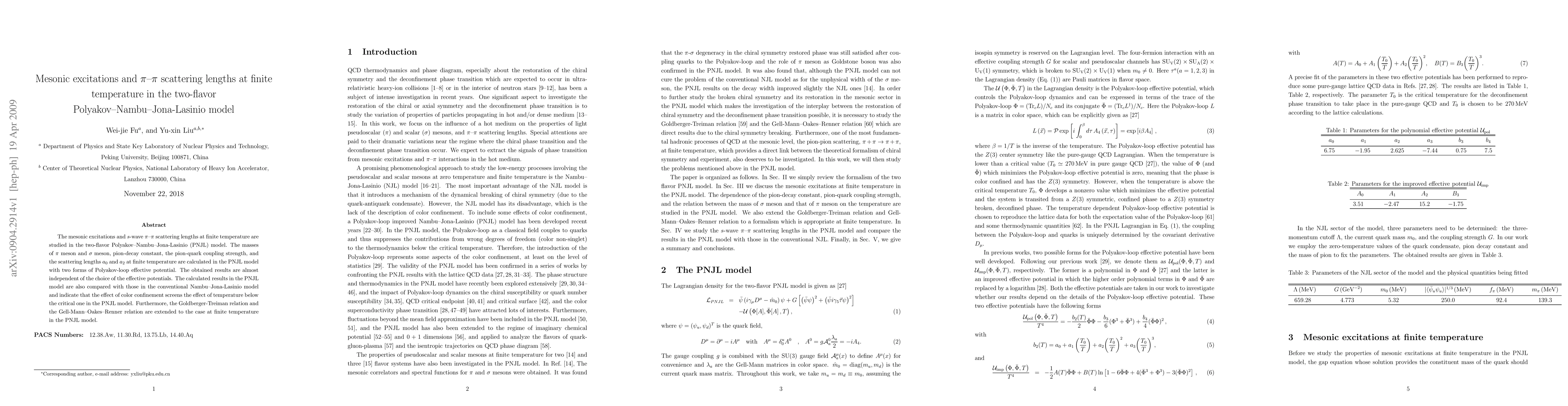 This paper investigates mesonic excitations and pi-pi scattering lengths at finite temperature within the two-flavor Polyakov-Nambu-Jona-Lasinio (PNJL) model, finding results largely independent of the chosen Polyakov-loop effective potential. Comparisons with the conventional Nambu-Jona-Lasinio model suggest that color confinement mitigates temperature effects below the critical temperature.
