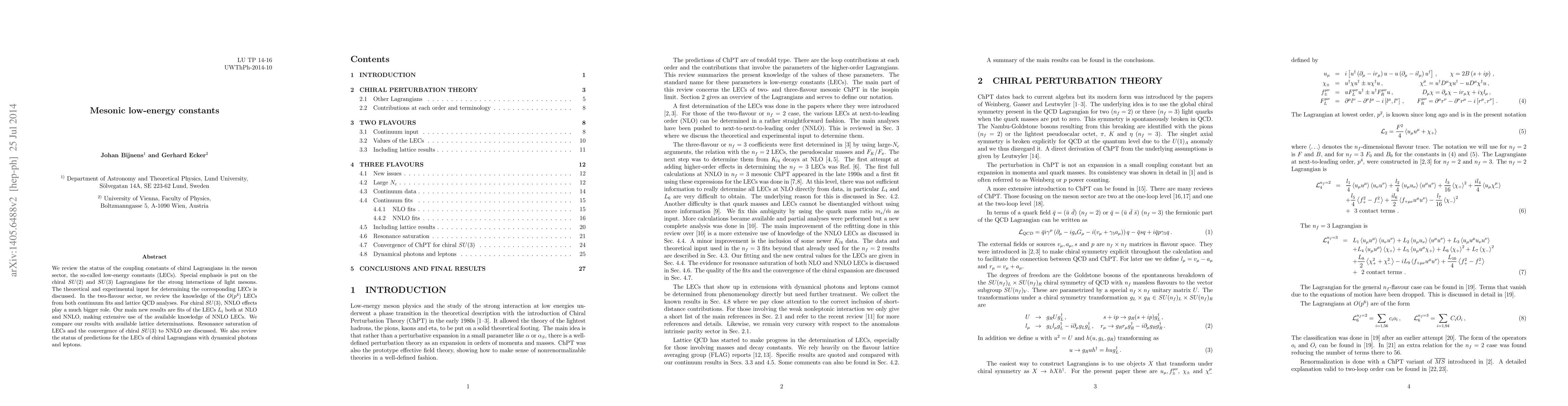 We review the status of the coupling constants of chiral Lagrangians in the meson sector, the so-called low-energy constants (LECs). Special emphasis is put on the chiral $SU(2)$ and $SU(3)$ Lagrangians for the strong interactions of light mesons. The theoretical and experimental input for determining the corresponding LECs is discussed. In the two-flavour sector, we review the knowledge of the $O(p^4)$ LECs from both continuum fits and lattice QCD analyses. For chiral $SU(3)$, NNLO effects play a much bigger role. Our main new results are fits of the LECs $L_i$ both at NLO and NNLO, making extensive use of the available knowledge of NNLO LECs. We compare our results with available lattice determinations. Resonance saturation of LECs and the convergence of chiral $SU(3)$ to NNLO are discussed. We also review the status of predictions for the LECs of chiral Lagrangians with dynamical photons and leptons.