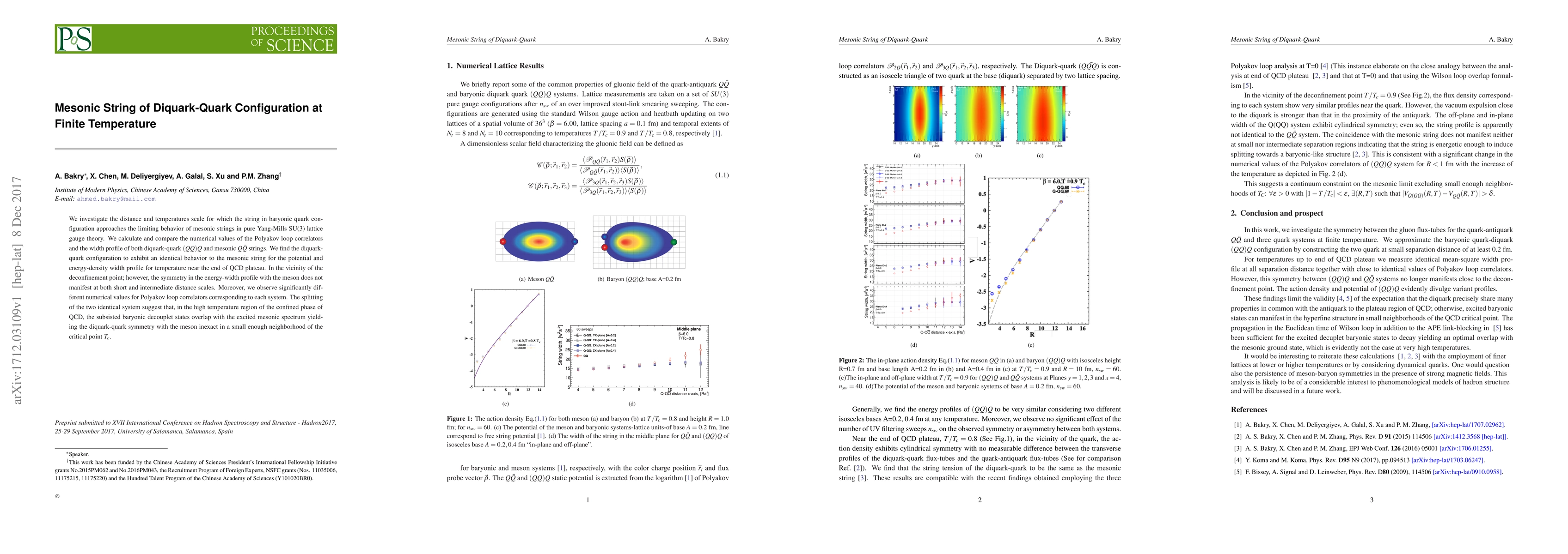 We investigate the distance and temperatures scale for which the string in baryonic quark configuration approaches the limiting behavior of mesonic strings in pure Yang-Mills SU(3) lattice gauge theory. We calculate and compare the numerical values of the Polyakov loop correlators and the width profile of both diquark-quark $(QQ)Q$ and mesonic $Q\bar{Q}$ strings. We find the diquark-quark configuration to exhibit an identical behavior to the mesonic string for the potential and energy-density width profile for temperature near the end of QCD plateau. In the vicinity of the deconfinement point; however, the symmetry in the energy-width profile with the meson does not manifest at both short and intermediate distance scales. Moreover, we observe significantly different numerical values for Polyakov loop correlators corresponding to each system. The splitting of the two identical system suggest that, in the high temperature region of the confined phase of QCD, the subsisted baryonic decouplet states overlap with the excited mesonic spectrum yielding the diquark-quark symmetry with the meson inexact in a small enough neighborhood of the critical point $T_{c}$.