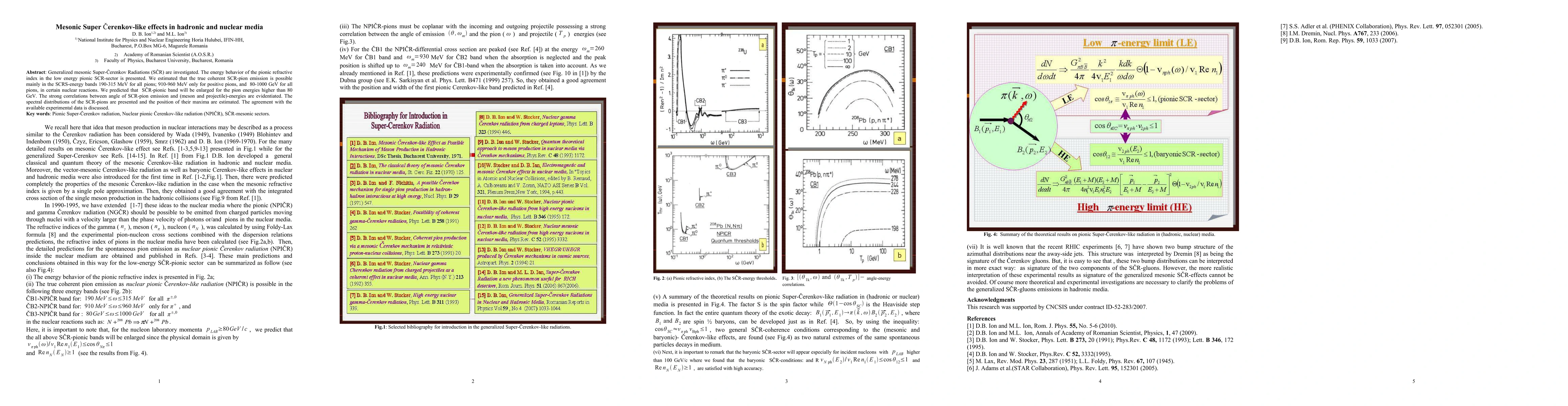 Generalized mesonic Super-\v{C}erenkov Radiations (S\v{C}R) are investigated. The energy behavior of the pionic refractive index in the low energy pionic SCR-sector is presented. We estimated that the true coherent SCR-pion emission is possible mainly in the SCRS-energy bands 190-315 MeV for all pions; 910-960 MeV only for positive pions, and 80-1000 GeV for all pions, in certain nuclear reactions. We predicted that S\v{C}R-pionic band will be enlarged for the pion energies higher than 80 GeV. The strong correlations between angle of SCR-pion emission and (meson and projectile)-energies are evidentiated. The spectral distributions of the SCR-pions are presented and the position of their maxima are estimated. The agreement with the available experimental data is discussed.
