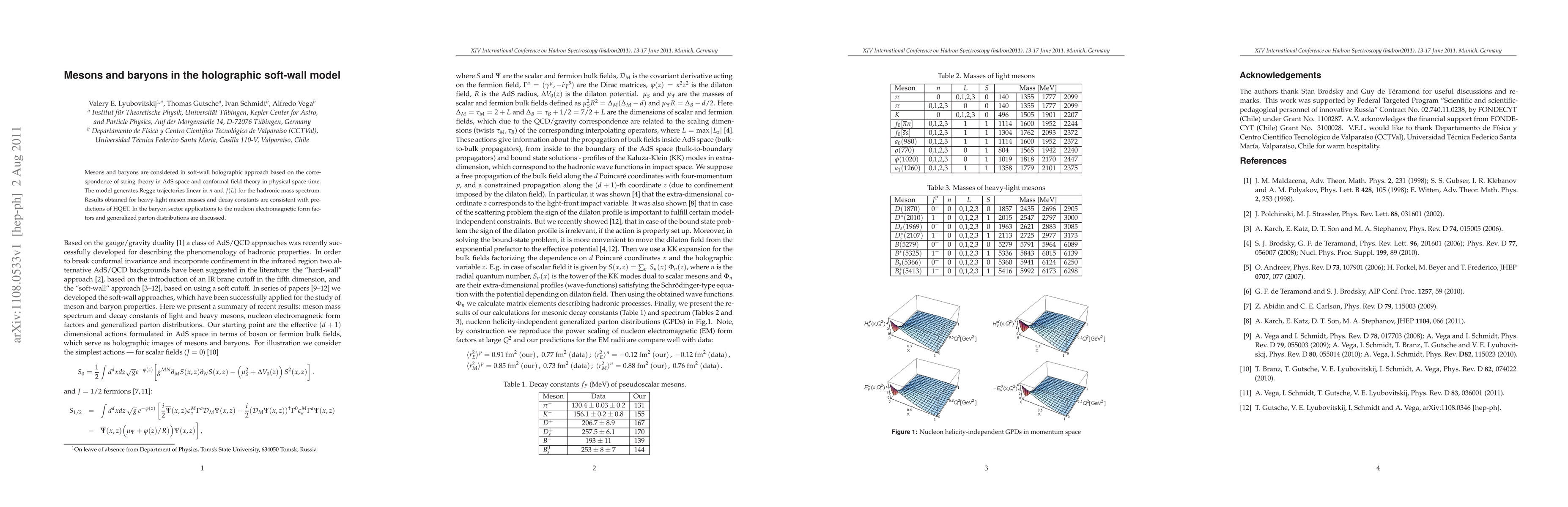This paper explores mesons and baryons using a soft-wall holographic model in AdS/CFT correspondence, generating linear Regge trajectories for hadronic masses. It finds agreement with heavy-light meson masses and decay constants from HQET and discusses nucleon electromagnetic form factors and generalized parton distributions.