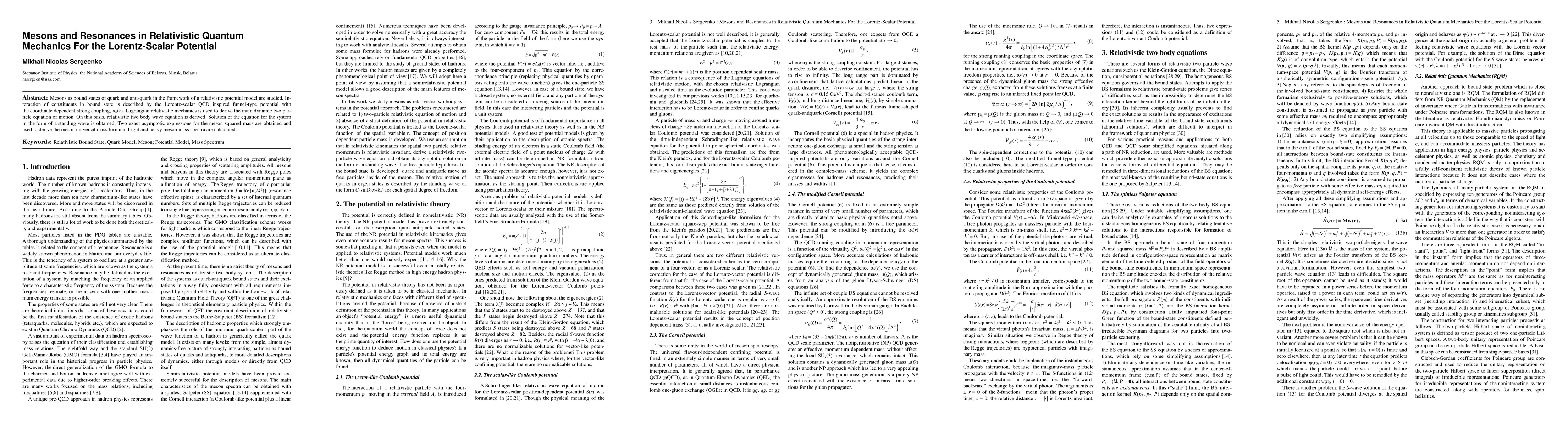 Mesons as bound states of quark and anti-quark in the framework of a relativistic potential model are studied. Interaction of constituents in bound state is described by the Lorentz-scalar QCD inspired funnel-type potential with the coordinate dependent strong coupling, {\alpha}S(r). Lagrangian relativistic mechanics is used to derive the main dynamic two particle equation of motion. On this basis, relativistic two body wave equation is derived. Solution of the equation for the system in the form of a standing wave is obtained. Two exact asymptotic expressions for the meson squared mass are obtained and used to derive the meson universal mass formula. Light and heavy meson mass spectra are calculated.