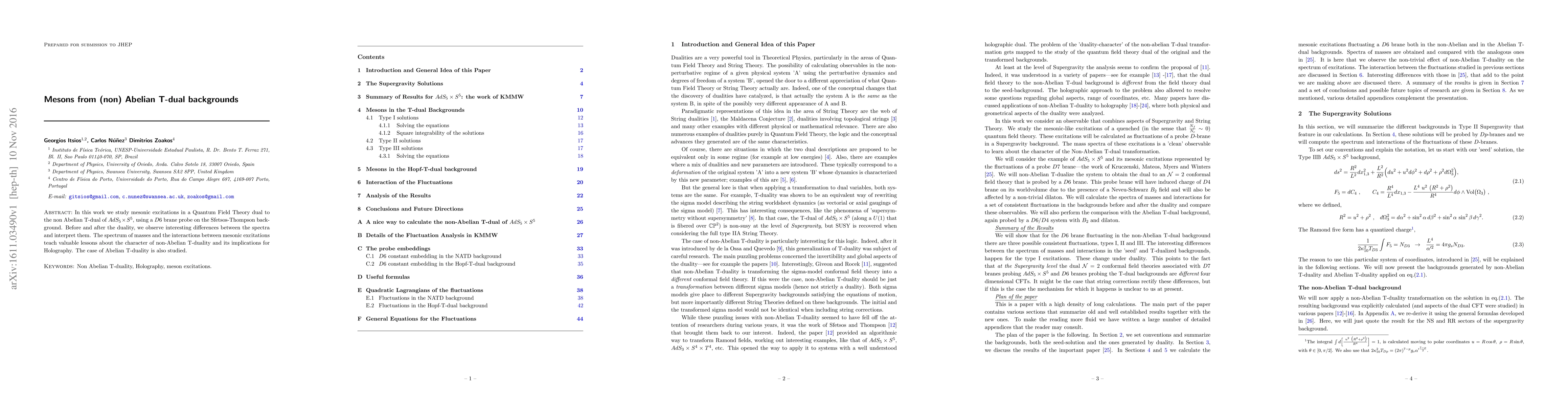 In this work we study mesonic excitations in a Quantum Field Theory dual to the non Abelian T-dual of $AdS_5\times S^5$, using a D6 brane probe on the Sfetsos-Thompson background. Before and after the duality, we observe interesting differences between the spectra and interpret them. The spectrum of masses and the interactions among mesonic excitations teach valuable lessons about the character of non-Abelian T-duality and its implications for Holography. The case of Abelian T-duality is also studied.
